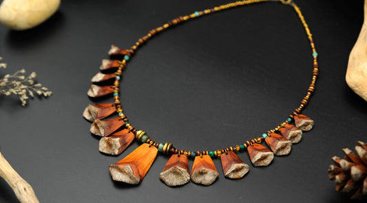 Halskette aus Kiefernzapfenschuppen mit Citrin, Granat & Smaragd