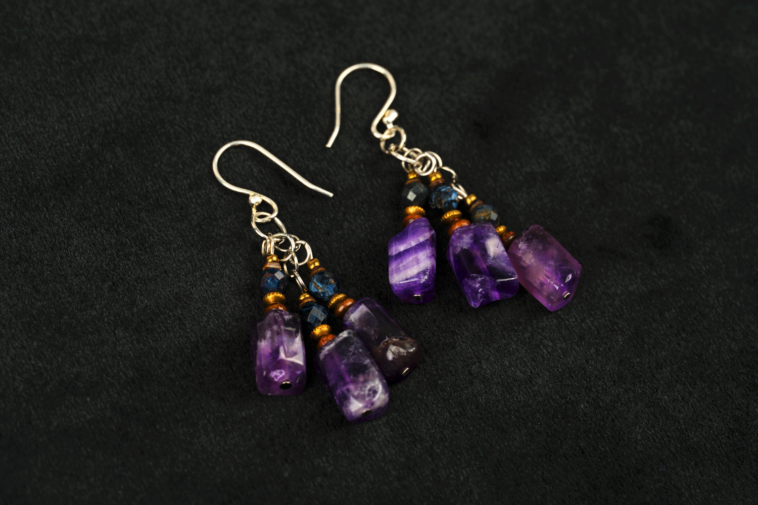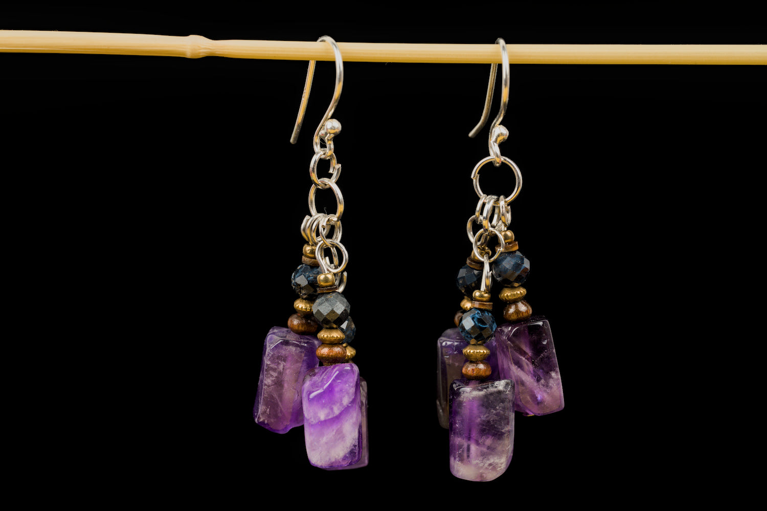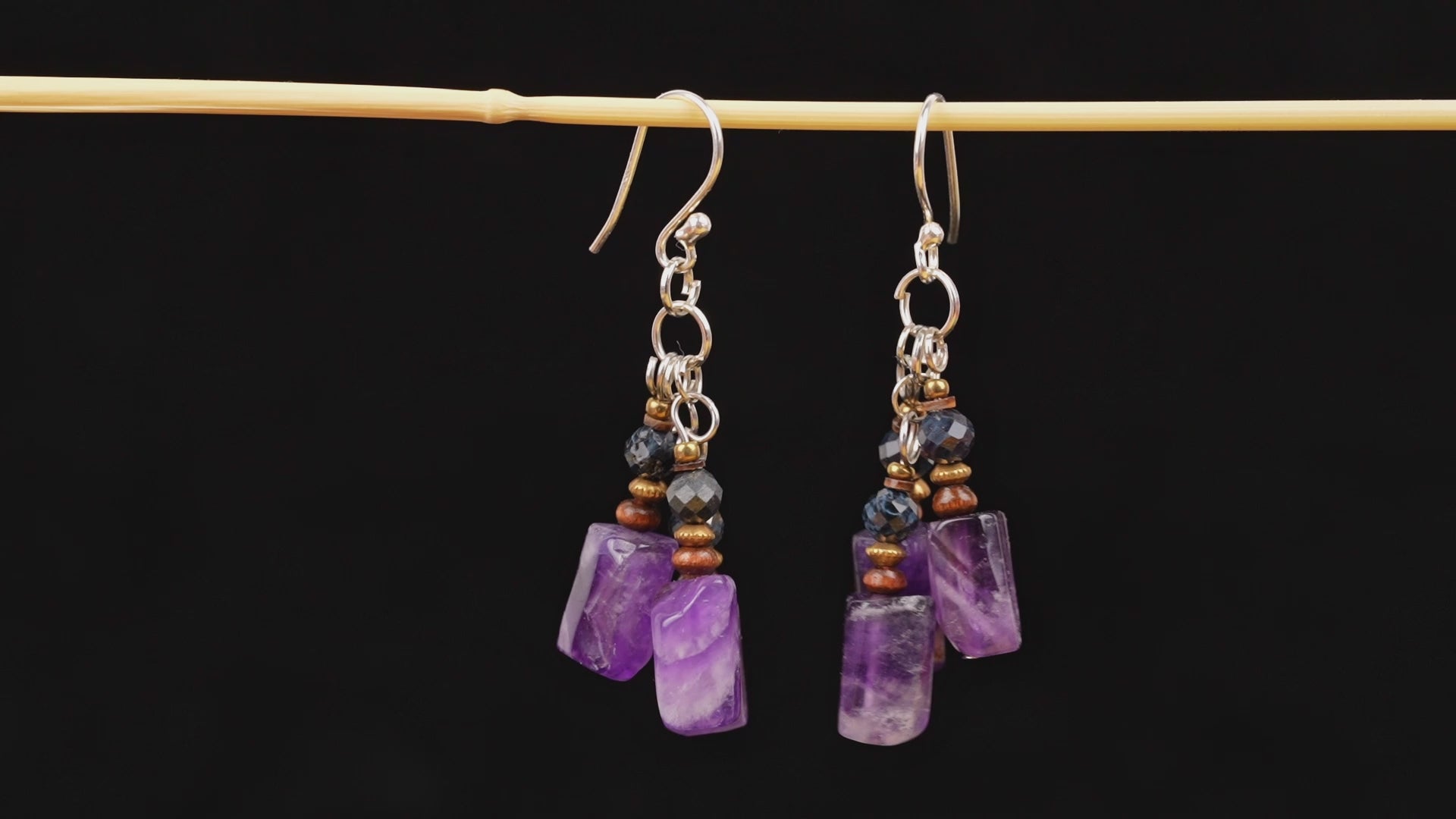Diese handgefertigten Ohrringe vereinen die ruhige Tiefe des Amethysts mit der lebendigen Struktur von Pietersit.