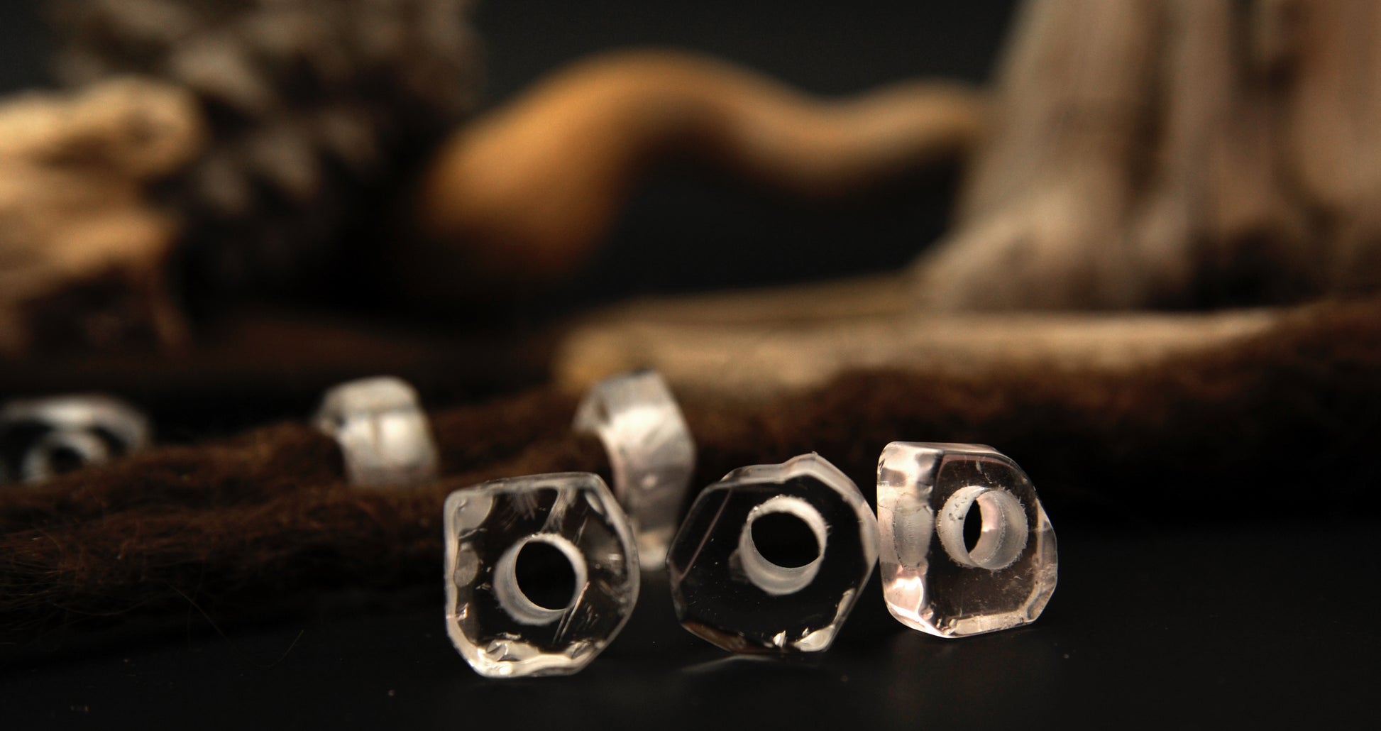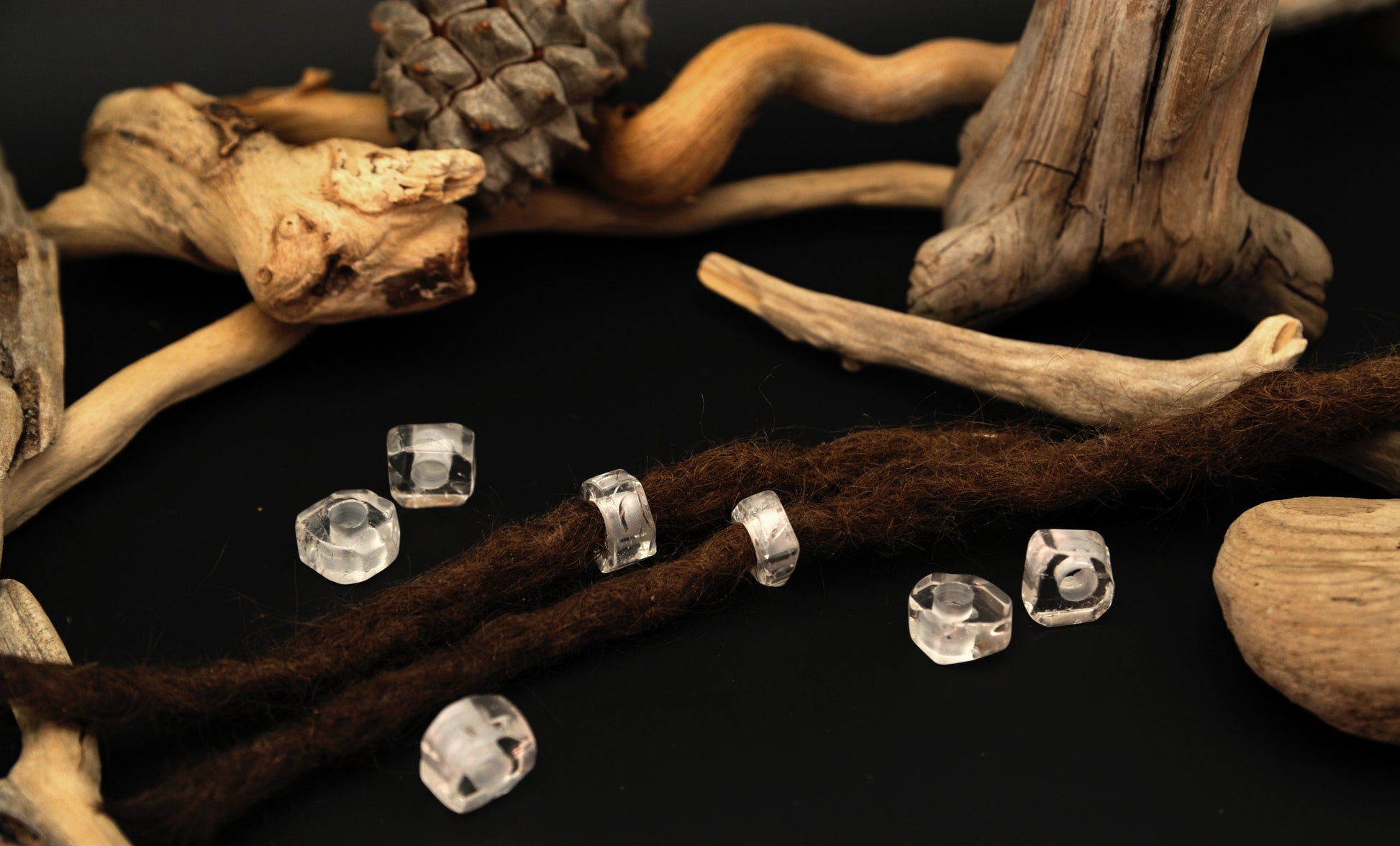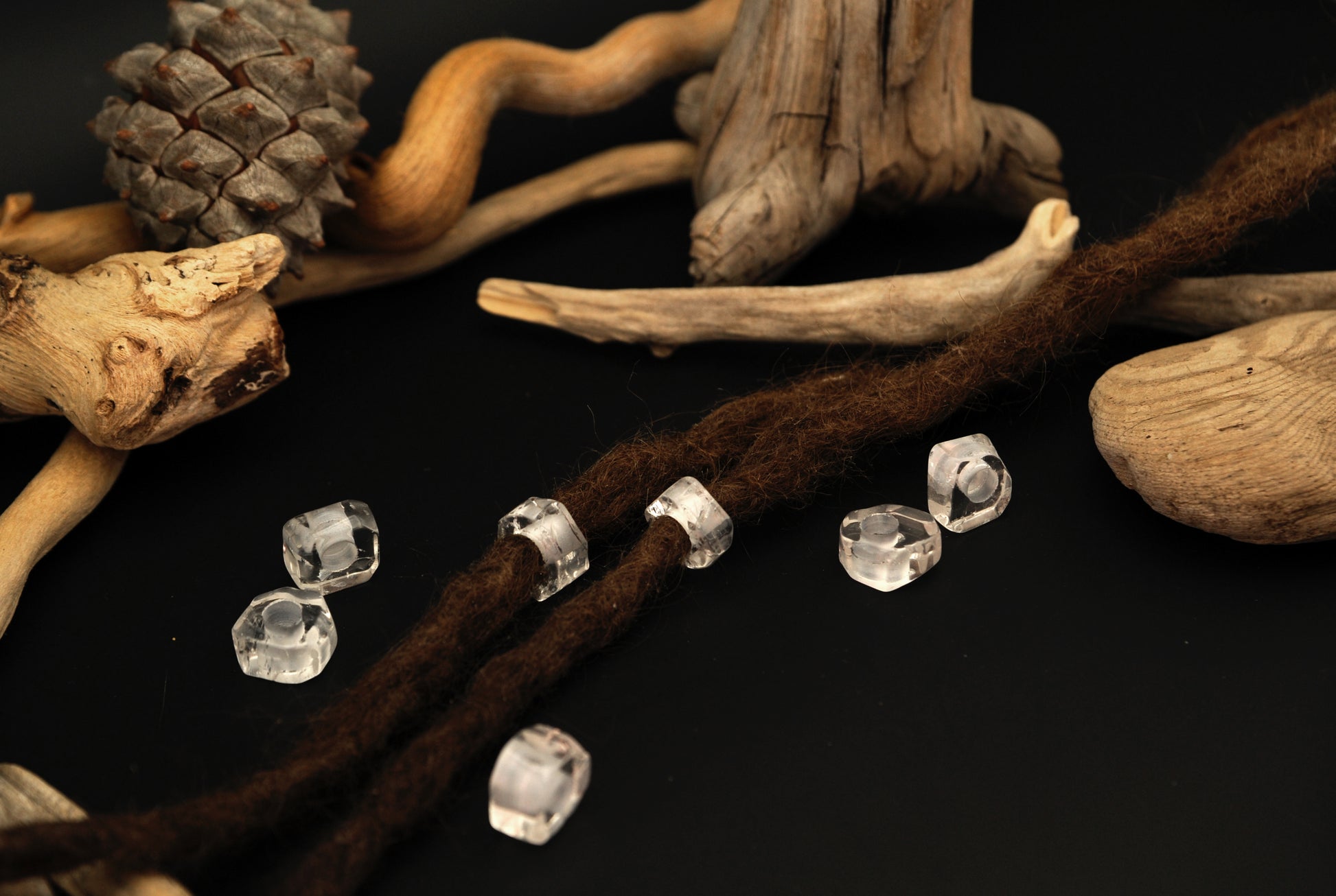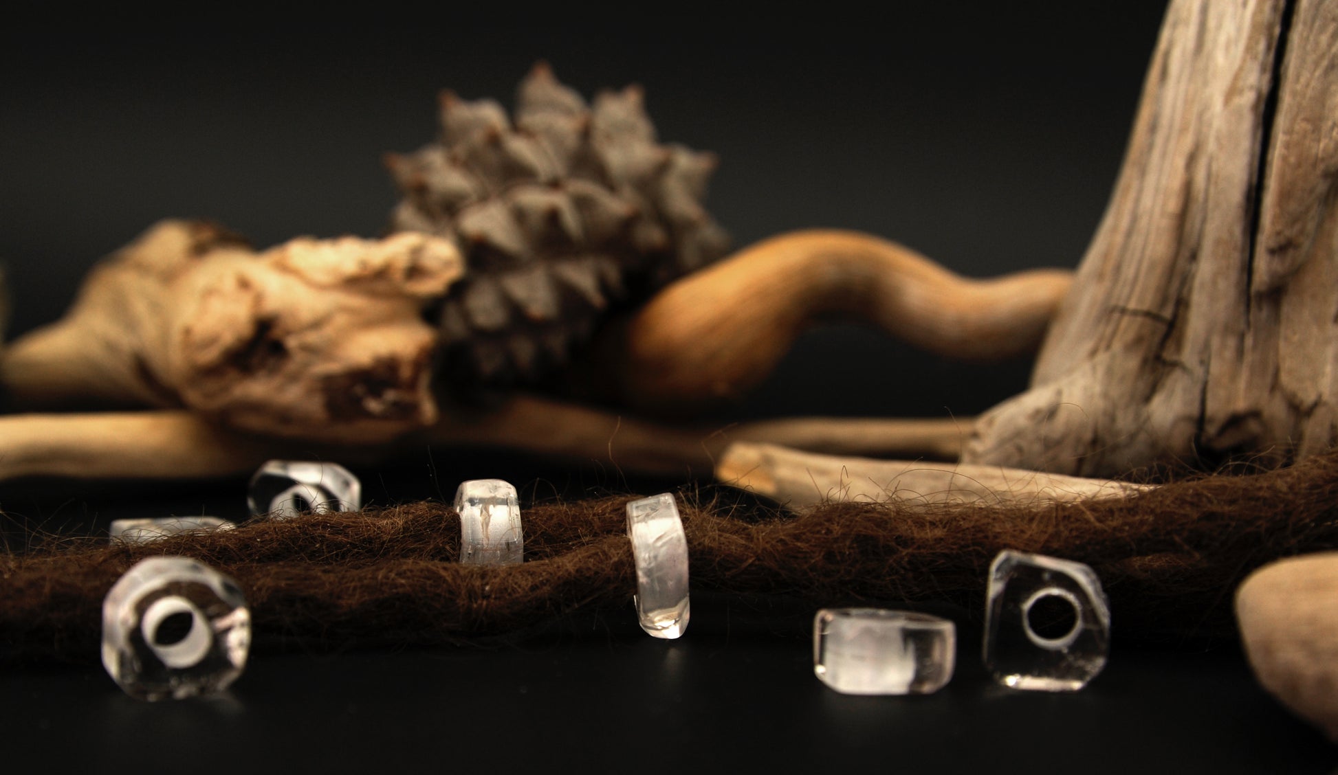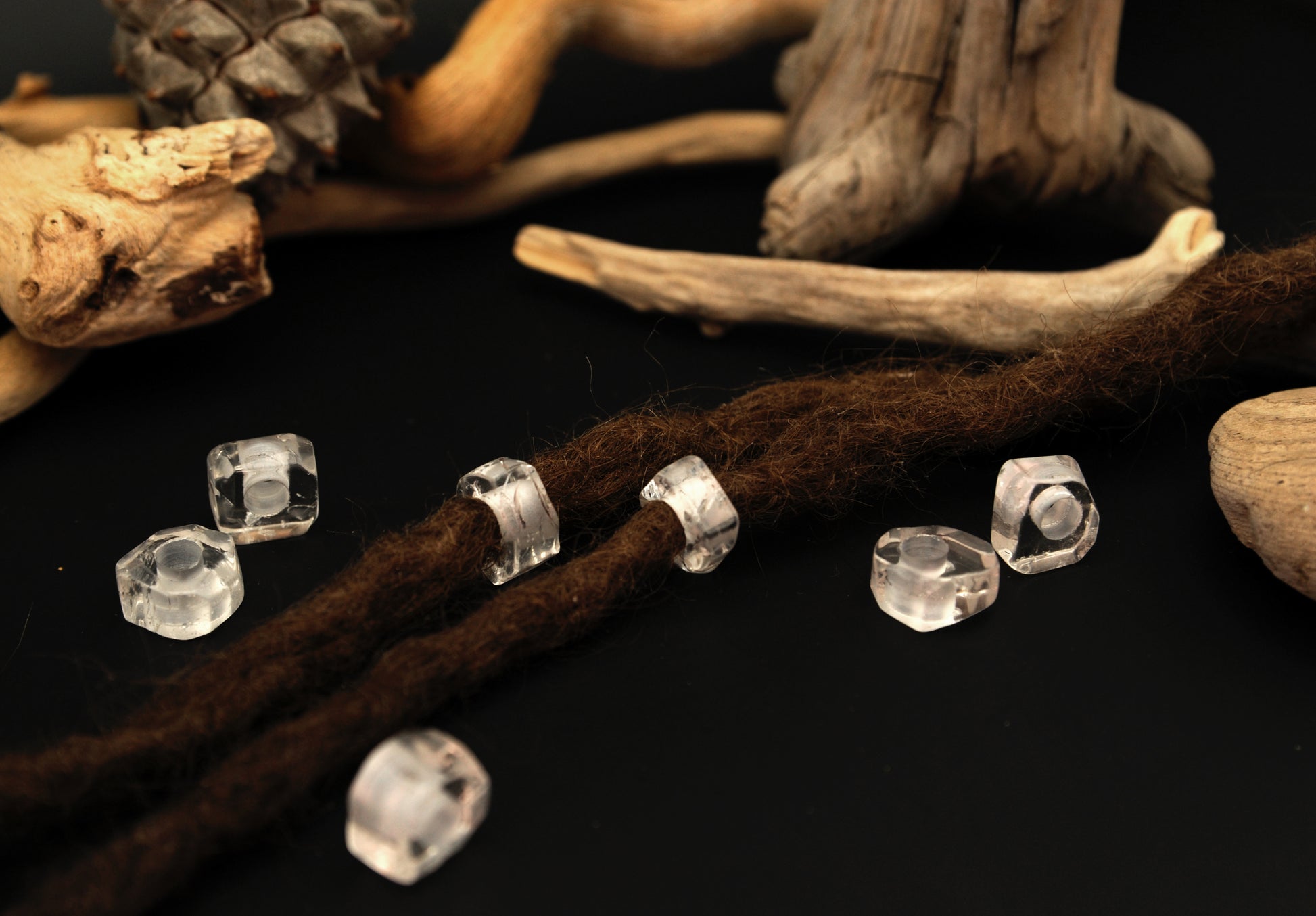 Die scheibenförmigen Perlen sind rundum glatt und haben einen wählbaren Lochdurchmesser, damit sie leicht in Dreads oder geflochtenes Haar hineinüber gleiten. Dank der klaren Transparenz passen sie perfekt zu allen Haarfarben und lassen sich mit anderen Holz- oder Steinperlen kombinieren. Jede Perle ist ein Unikat mit subtilen Einschluss-Strukturen, wie sie nur die Natur erschaffen kann.