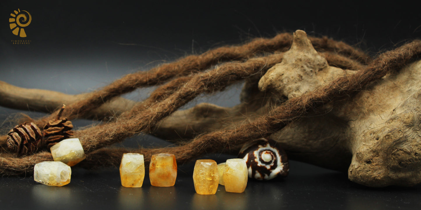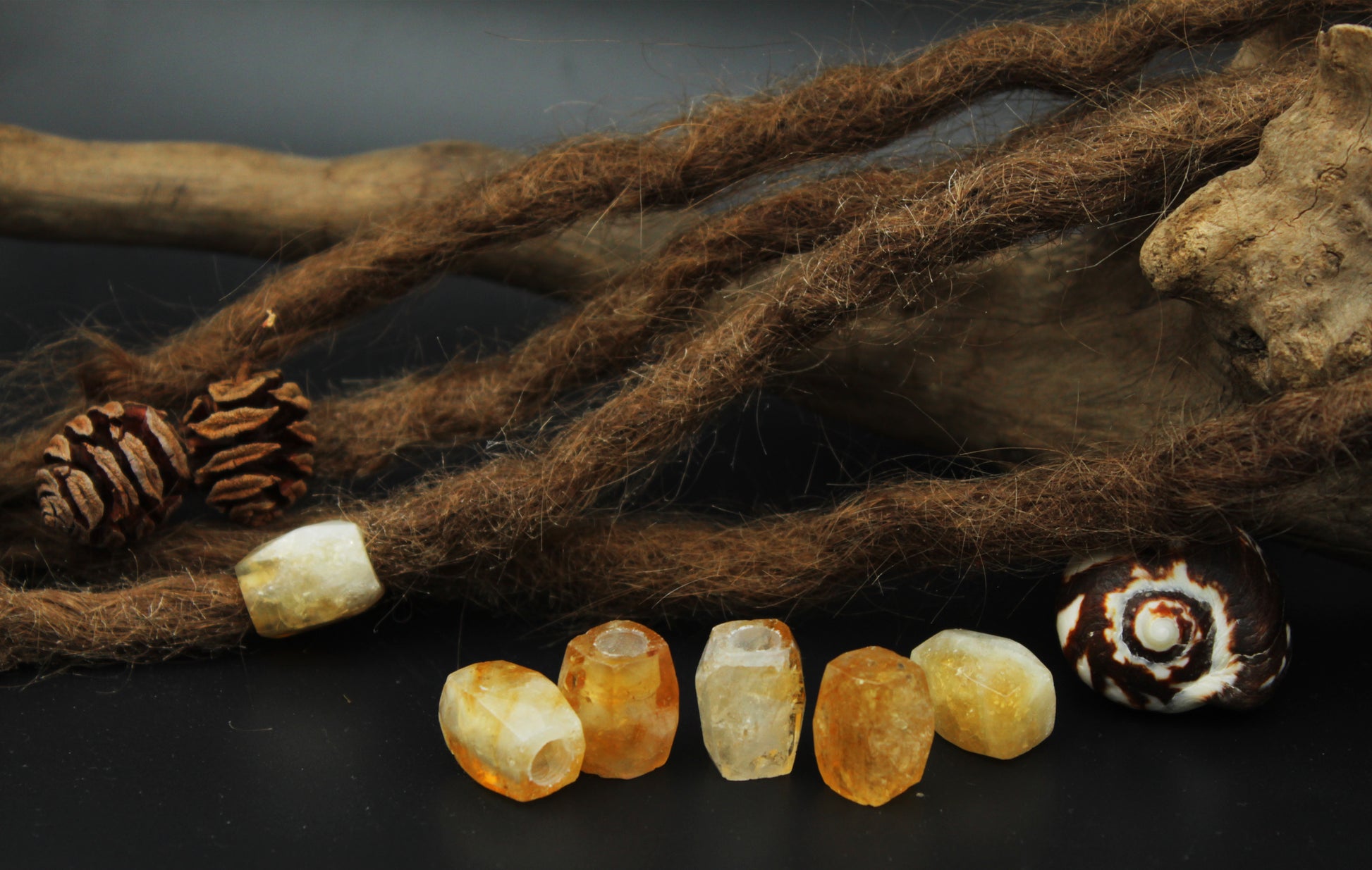 Die Perlen haben einen wählbaren Lochdurchmesser und gleiten dadurch leicht in Dreads oder geflochtenes Haar hinein. Dank ihrer kubischen Form liegen sie angenehm am Haar an, ohne zu stören, und harmonieren perfekt mit anderen Naturmaterialien wie Holz‑ oder Steinperlen. Jede Citrinperle zeigt individuelle Wachstumsstrukturen und feine Farbverläufe, wodurch jedes Set zu einem Unikat wird.