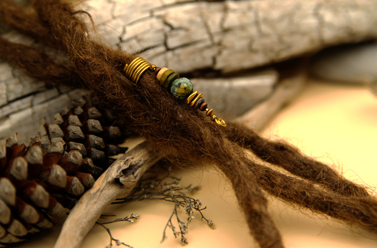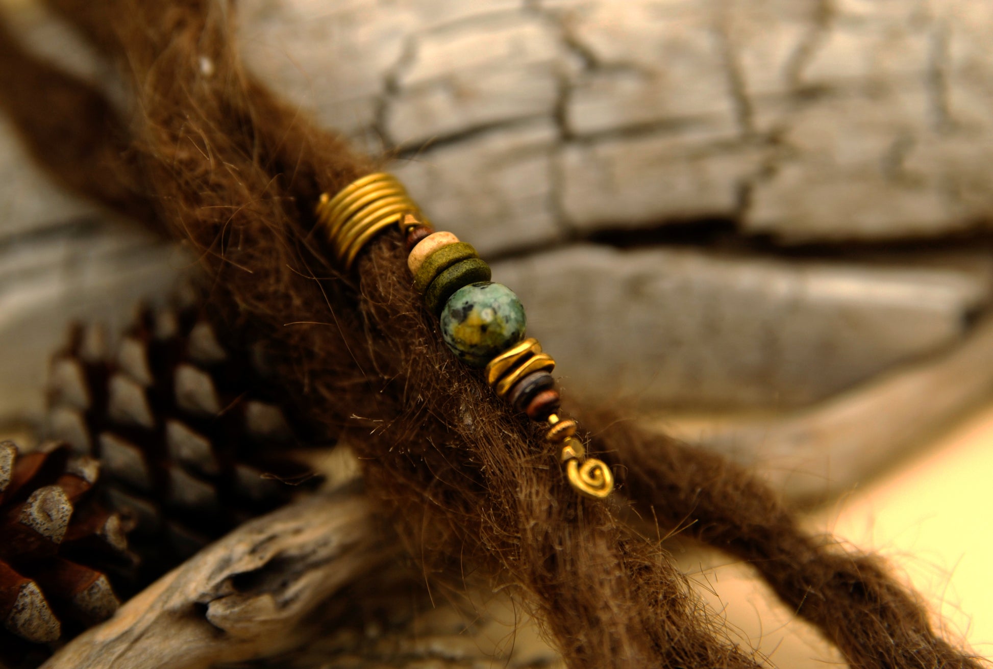 Diese handgefertigte Dreadlock-Perle vereint den kraftvollen grünen Türkis mit Holz- und Messingelementen zu einem harmonischen, naturverbundenen Schmuckstück.