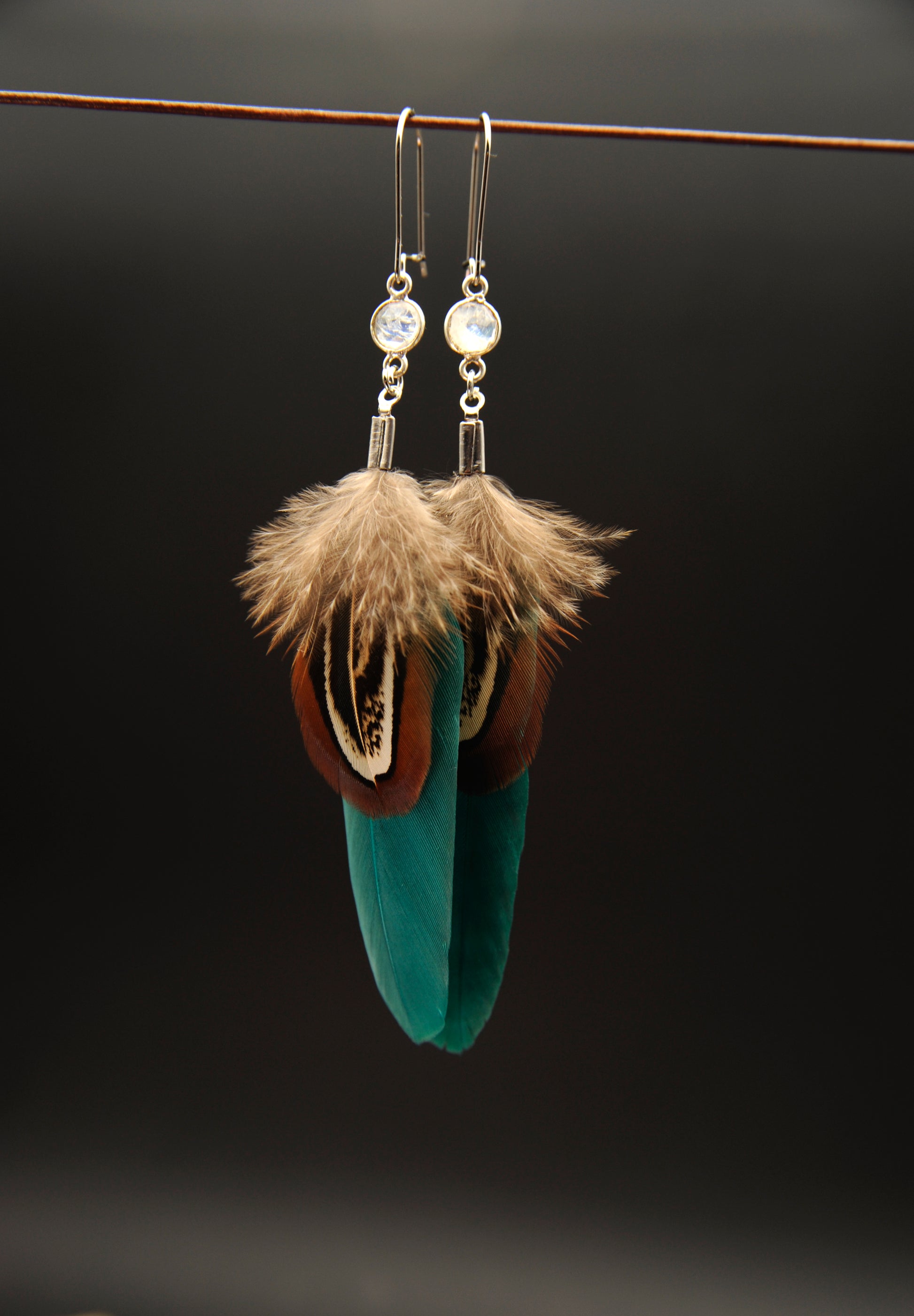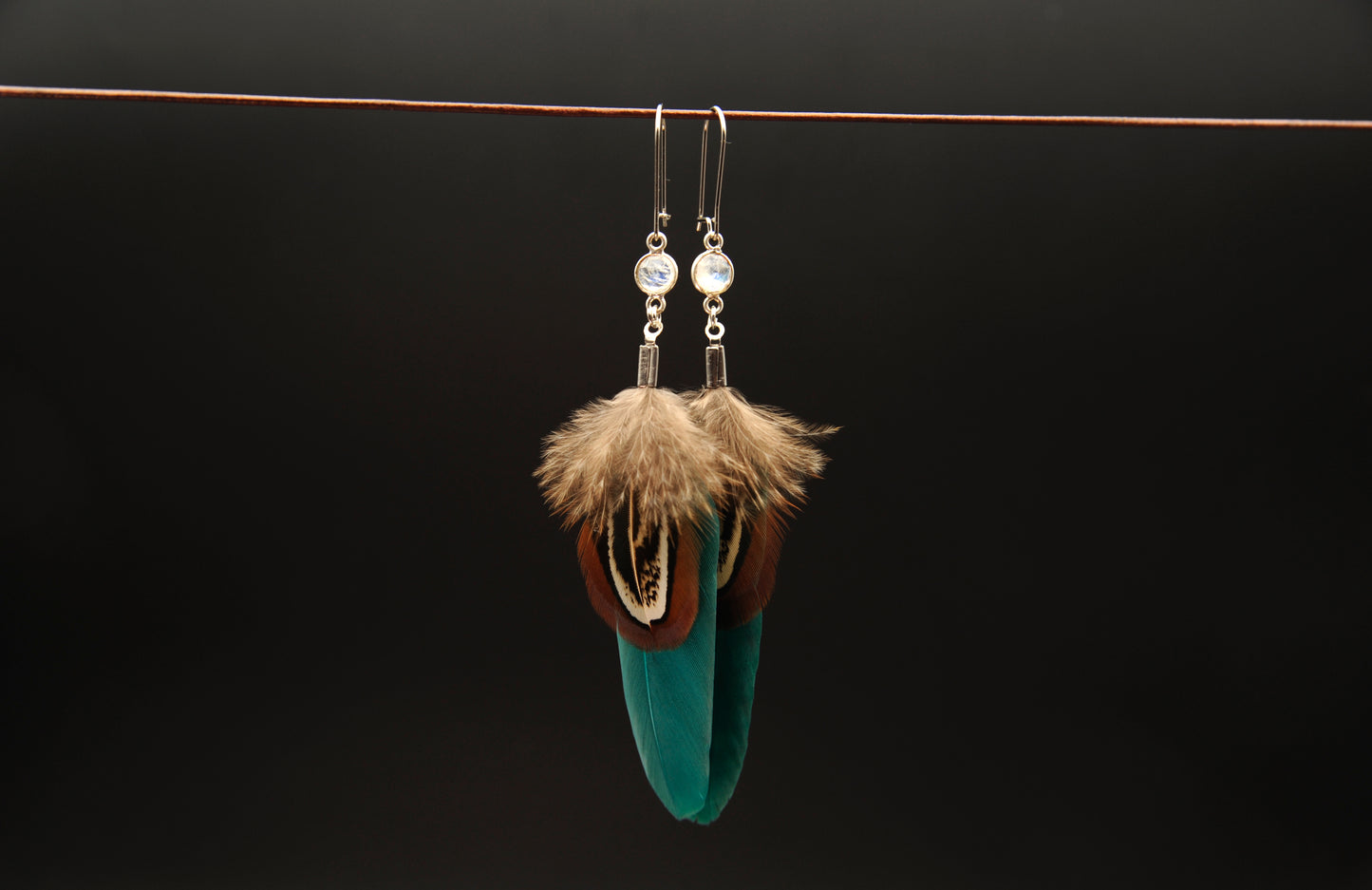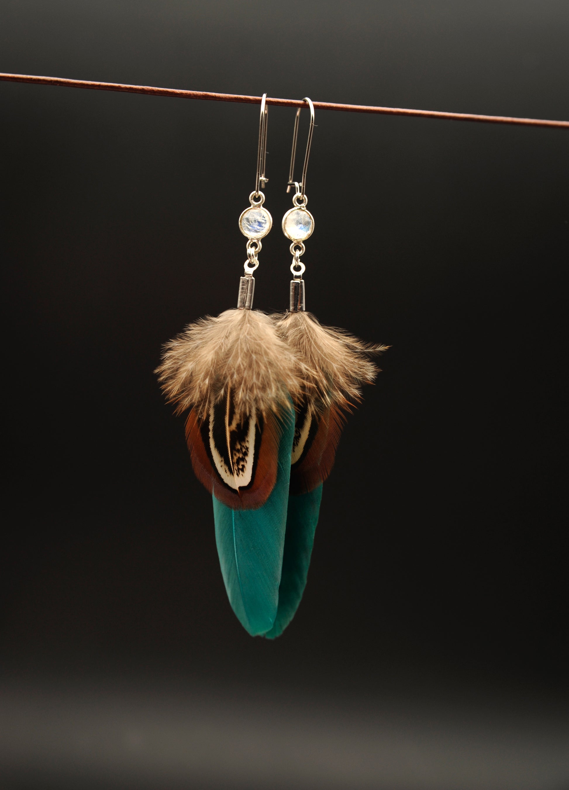 Feder Ohrringe mit weißem Labradorit in Silber – Grüne Gänsefeder, Wildfasan Rupffeder