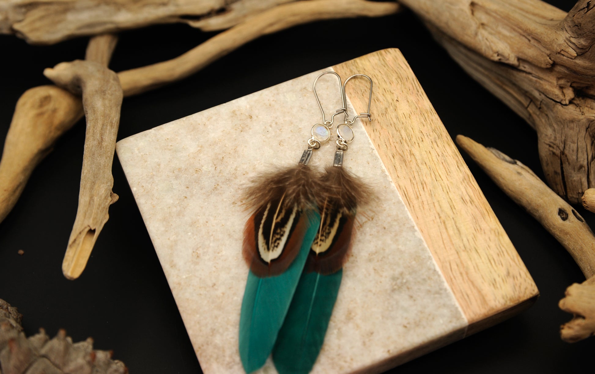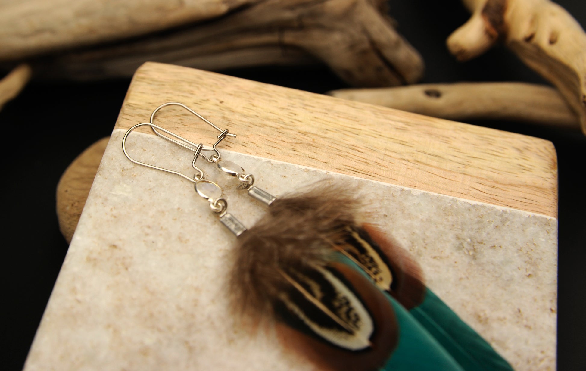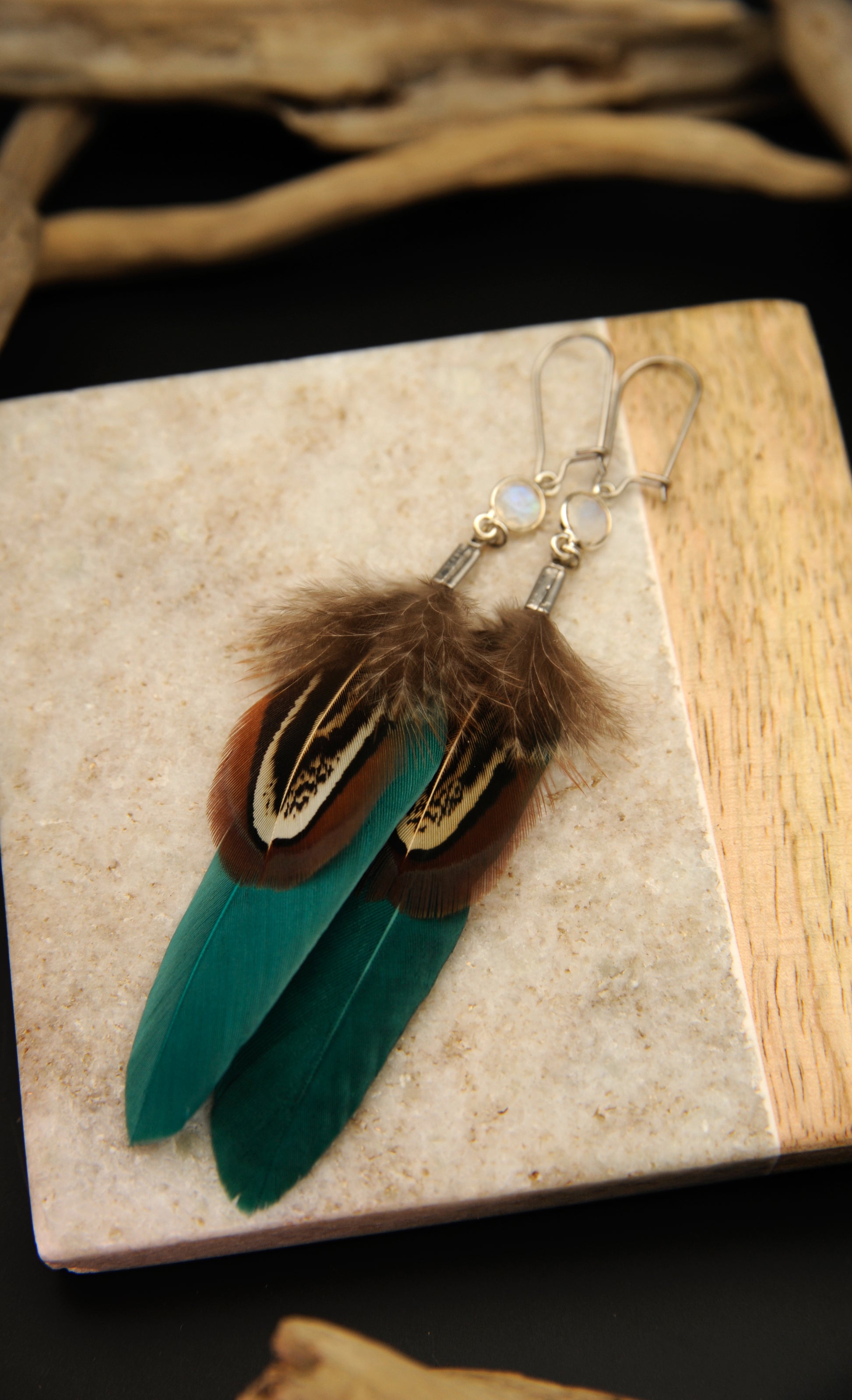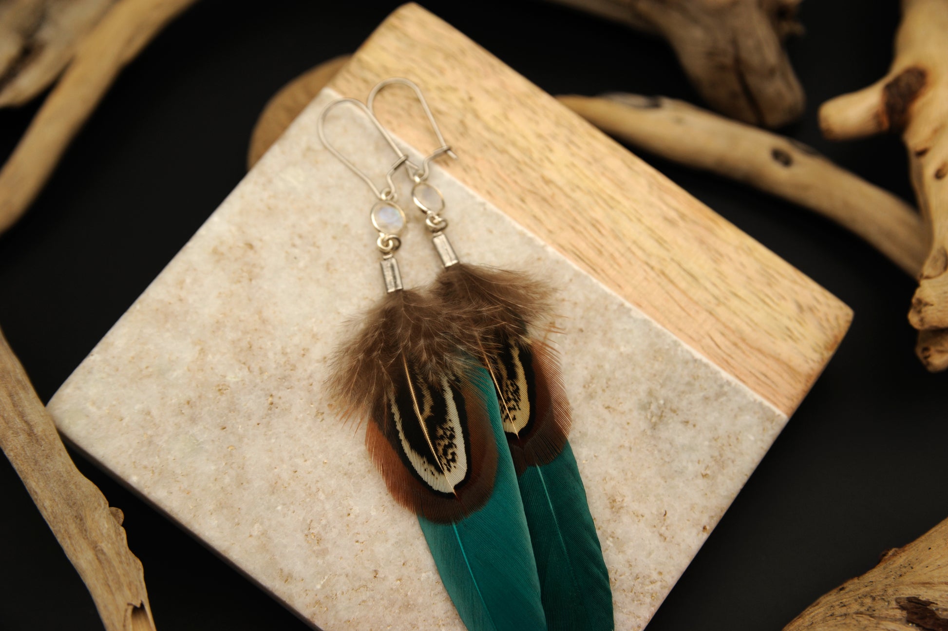 Feder Ohrringe mit weißem Labradorit in Silber – Grüne Gänsefeder, Wildfasan Rupffeder