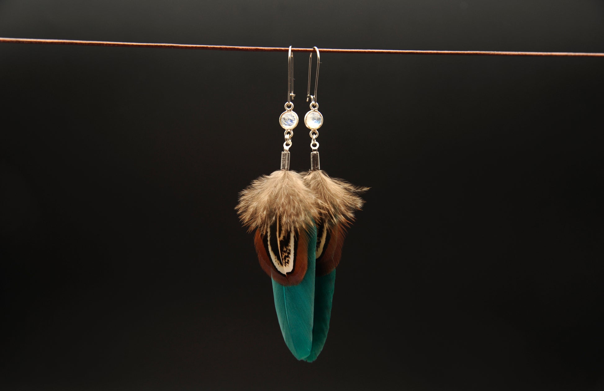 Die lange, smaragdgrün gefärbte Gänsefeder sorgt für einen ausdrucksstarken Farbakzent. Darüber liegt eine filigran gemusterte Wildfasan-Rupffeder, die jedem Paar einen unverwechselbaren Charakter verleiht.