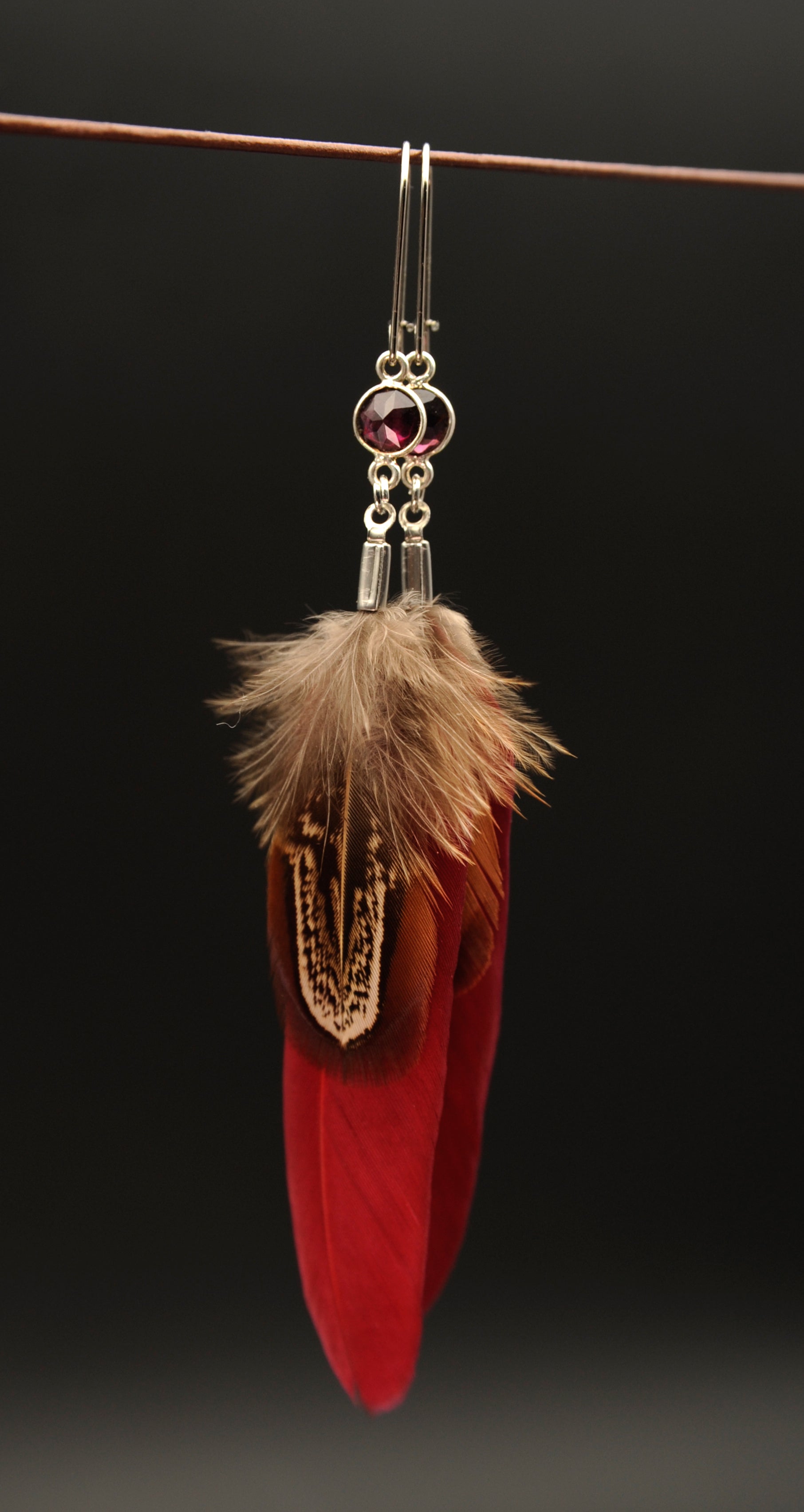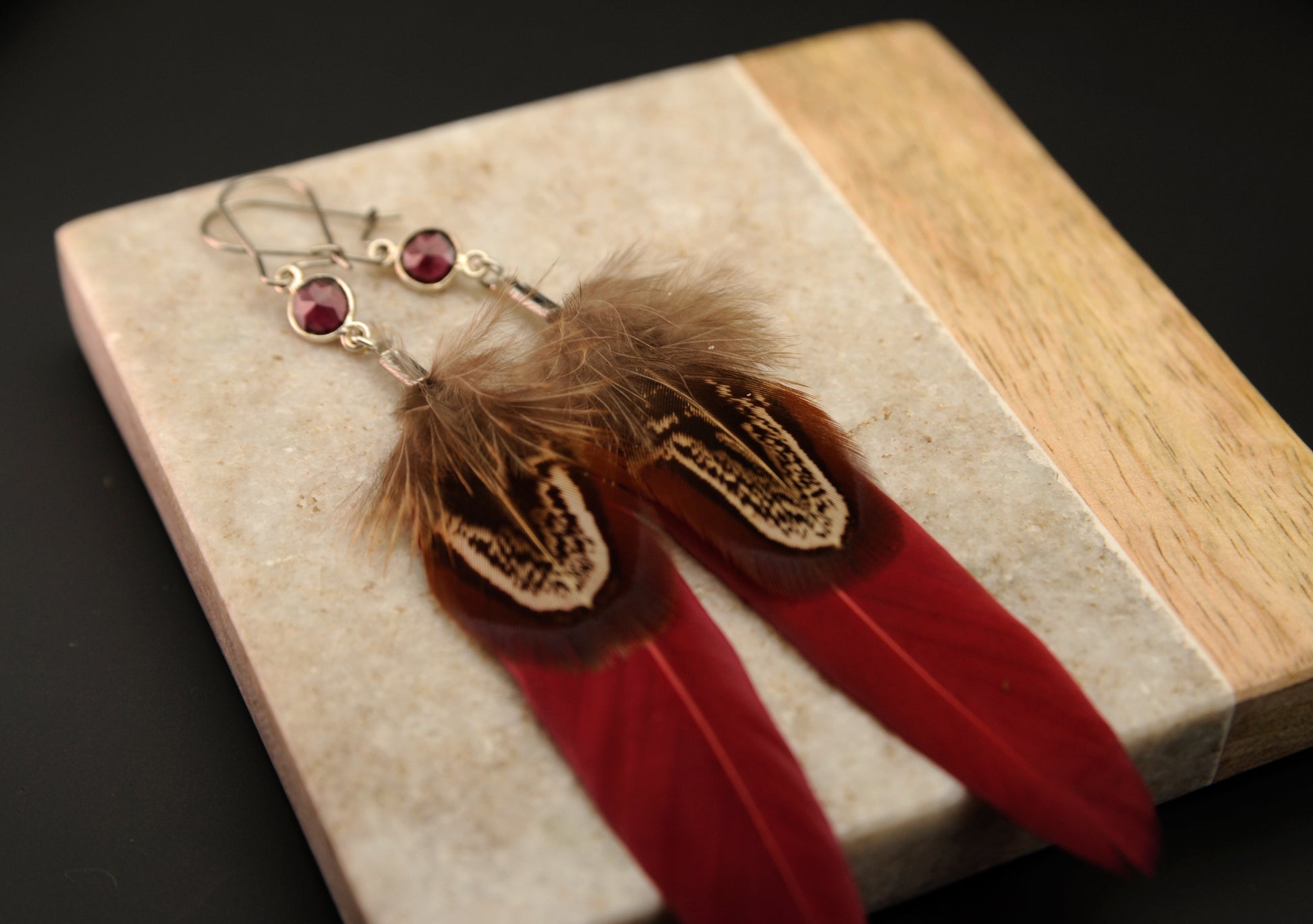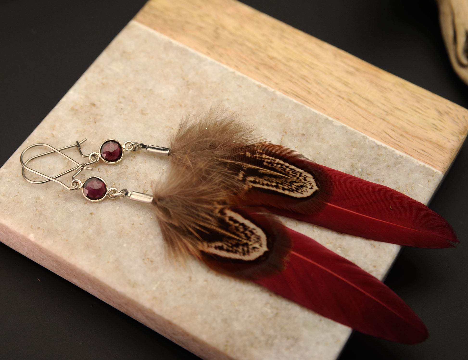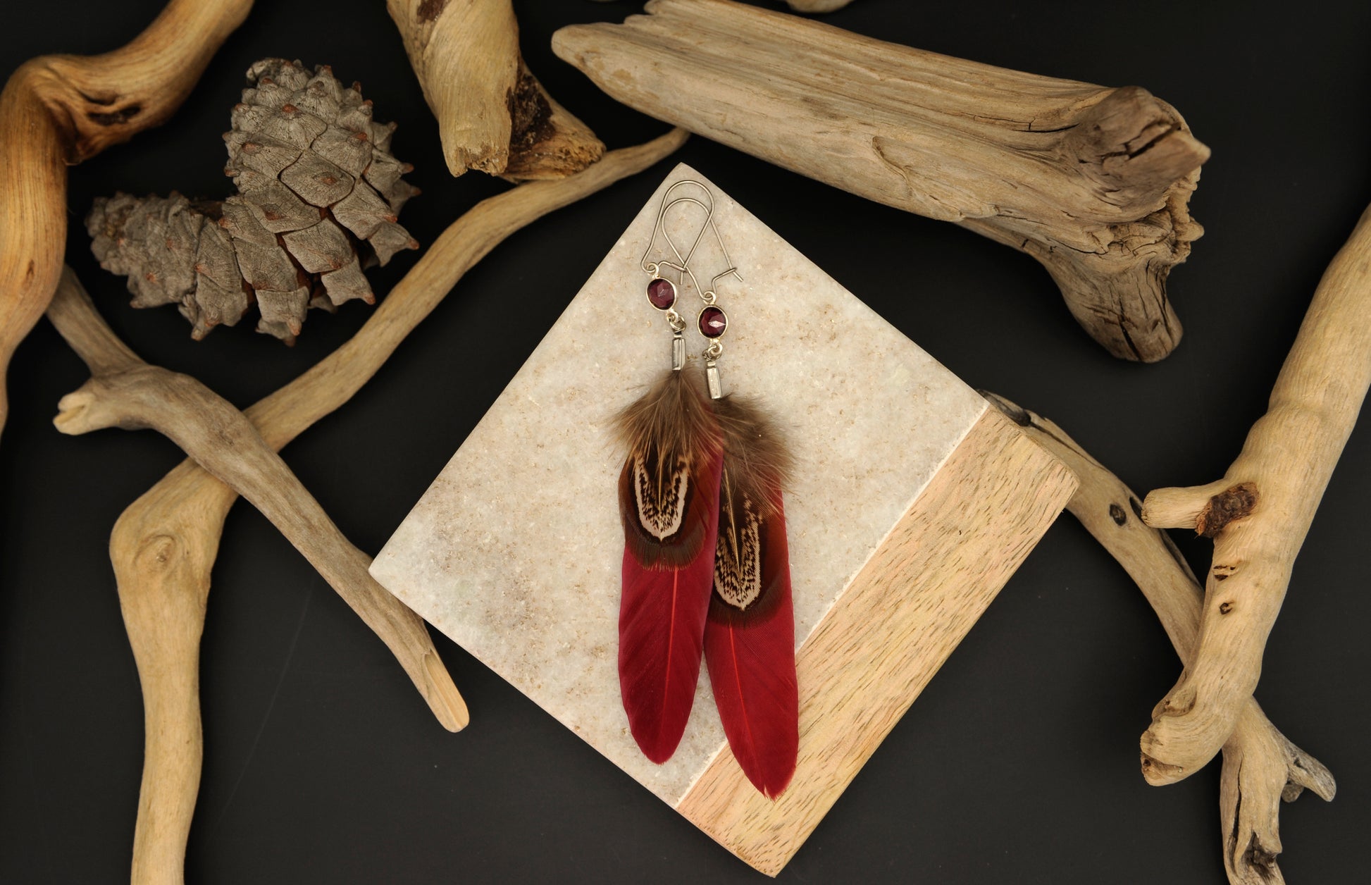 Feder Ohrringe mit Granat in Silber – Rote Gänsefeder, Wildfasan Rupffeder