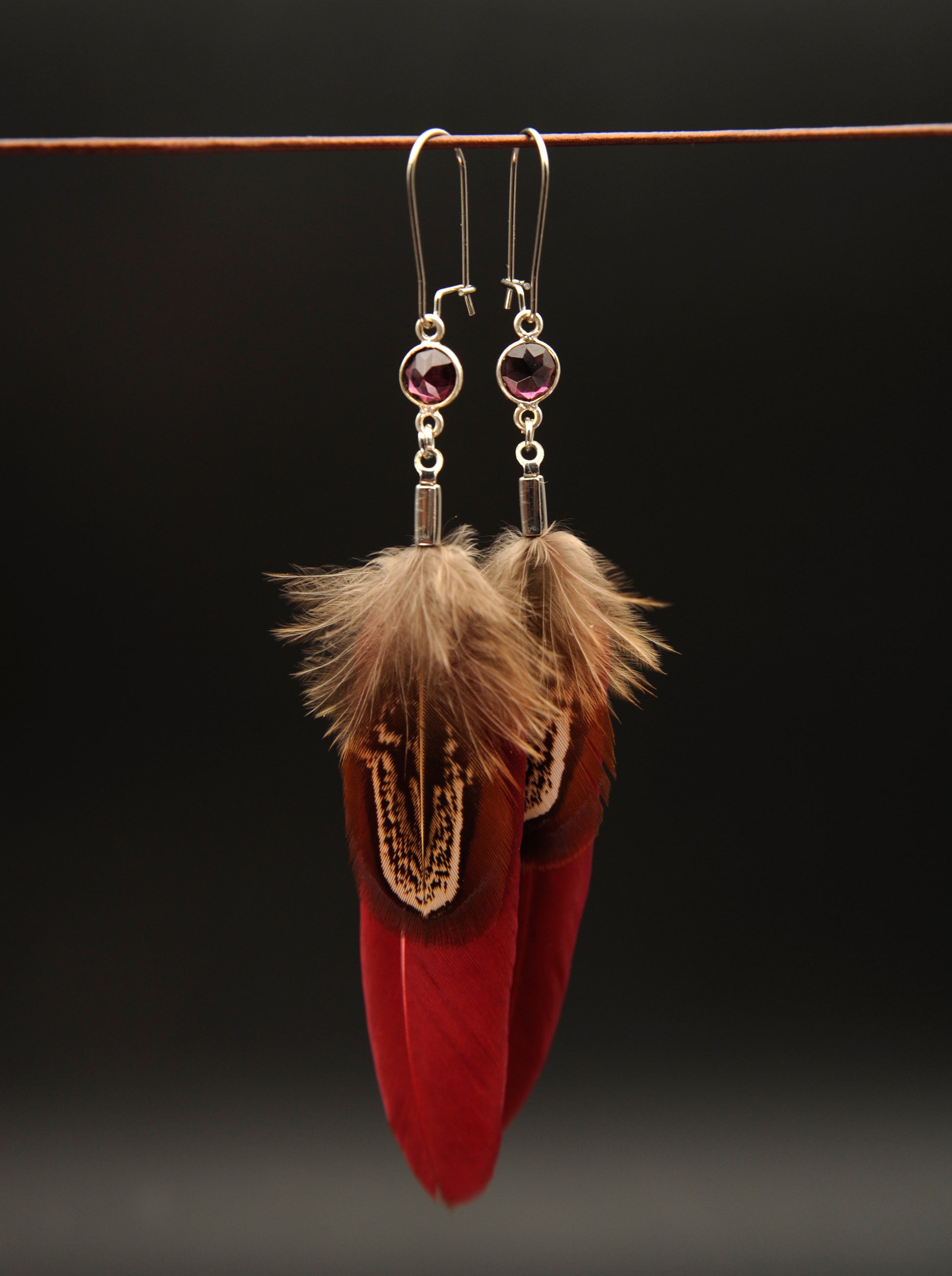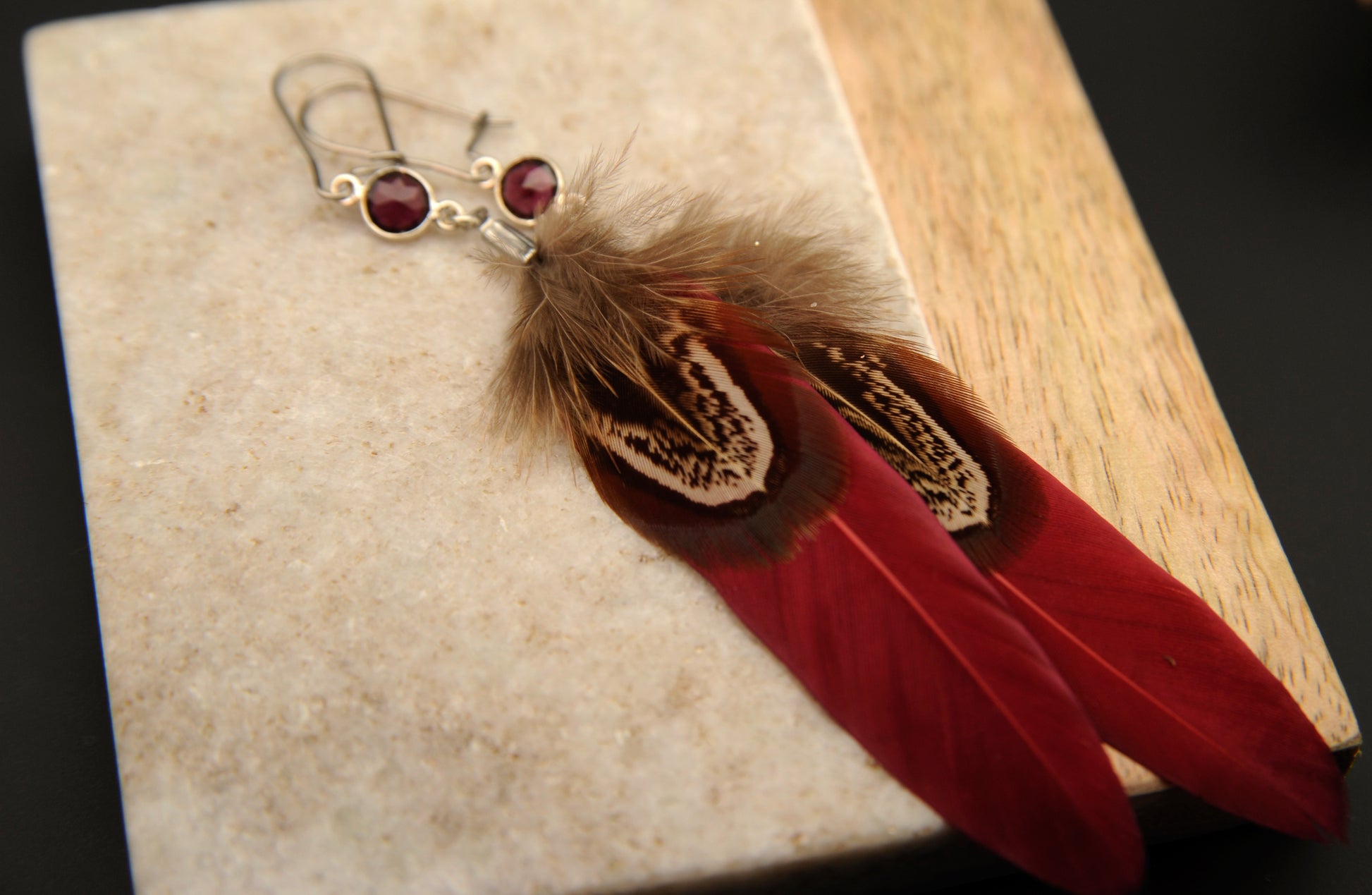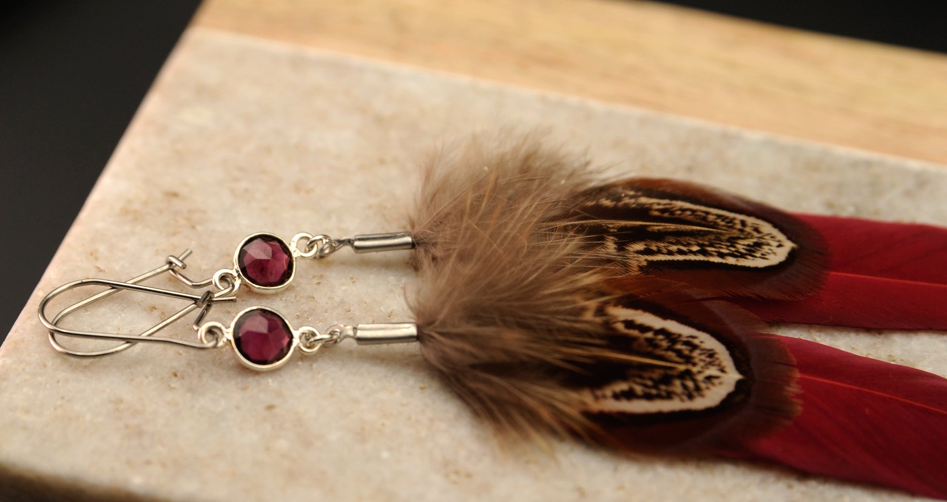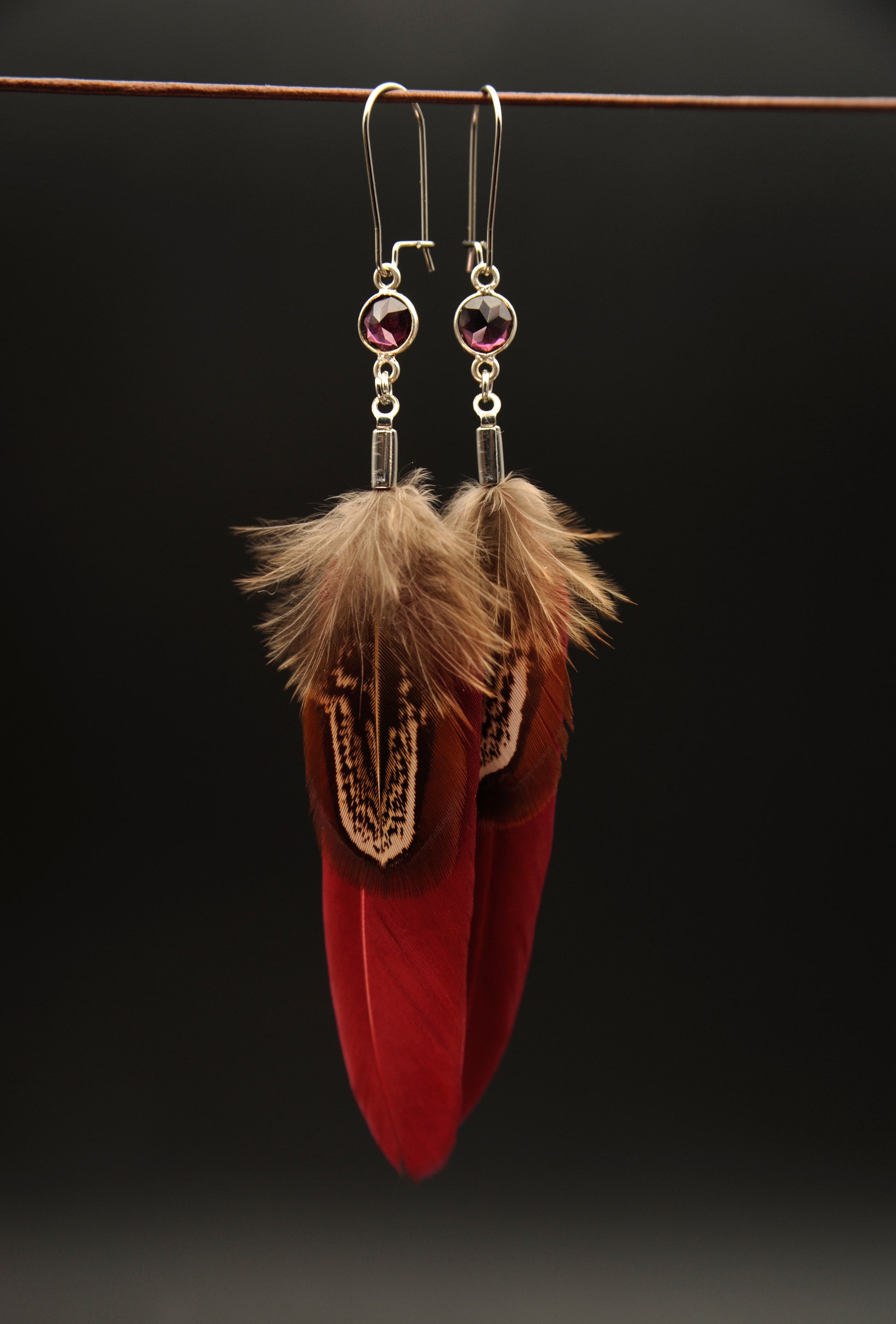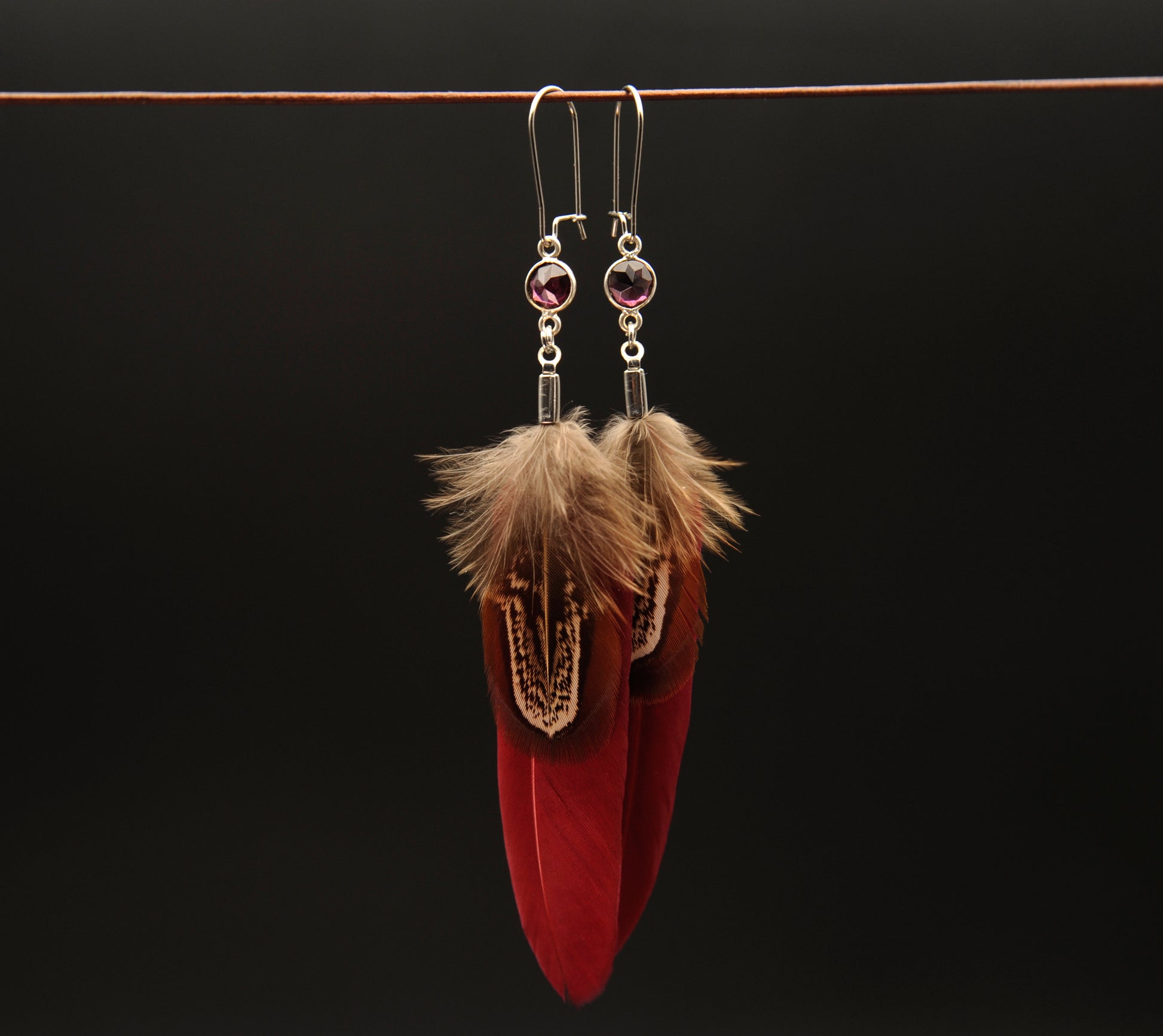 Feder Ohrringe mit Granat in Silber – Rote Gänsefeder, Wildfasan Rupffeder