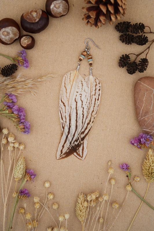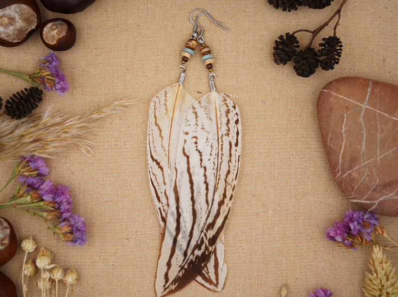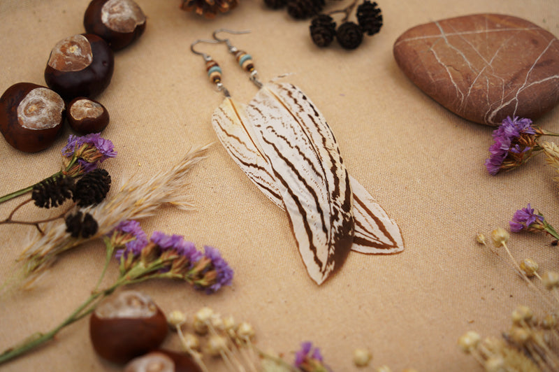 Diese handgefertigten Federohrringe aus echten weißen Goldfasan-Federn vereinen Leichtigkeit, Natürlichkeit und stilvolle Eleganz. Die feine Musterung in sanften Braun- und Cremetönen verleiht jedem Paar einen individuellen Charakter – kein Stück gleicht dem anderen.