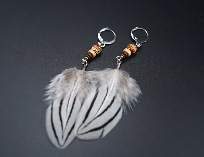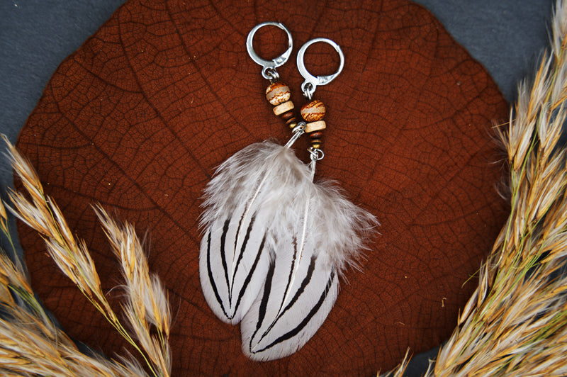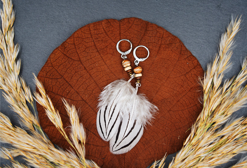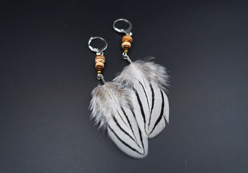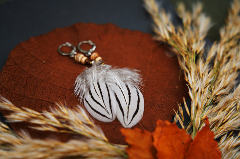 Diese handgefertigten Federohrringe aus echten Silberfasan-Rupffedern verbinden schlichte Eleganz mit natürlichem Charme. Die zarten Federn in sanftem Grau-Weiß mit markanten schwarzen Streifen verleihen deinem Look einen dezenten, aber ausdrucksstarken Akzent.
