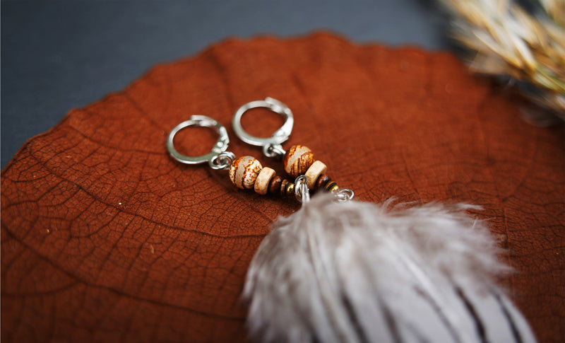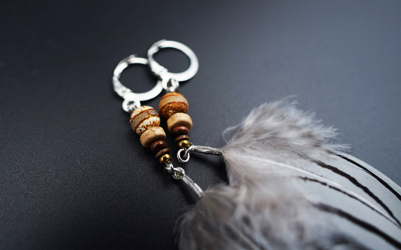 Design: Grau-weiße Federn mit schwarzen Streifen, kombiniert mit Holz- und Natursteinperlen