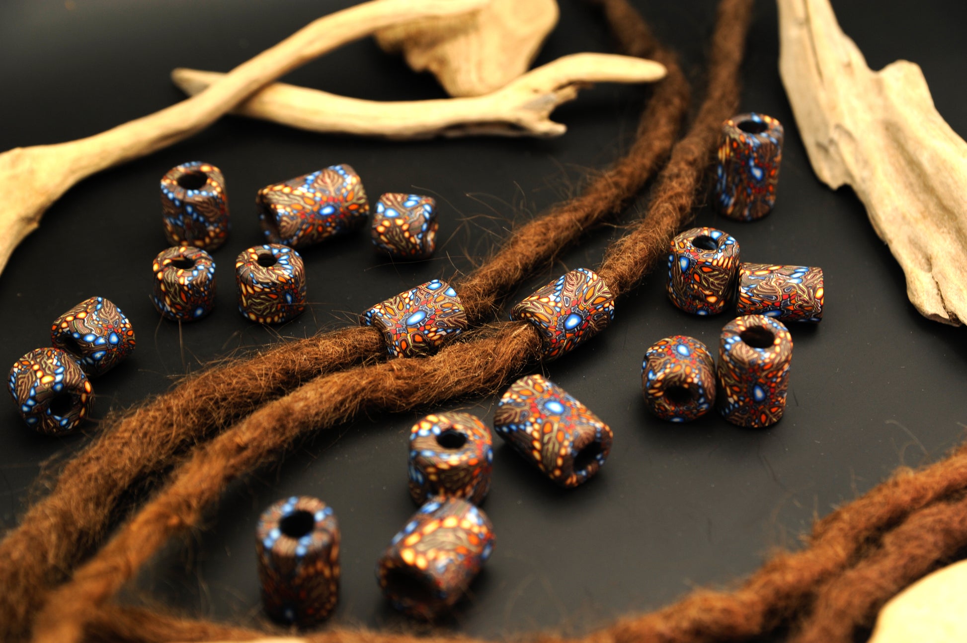 Leuchtendes Blau trifft auf Glutrot und erdiges Braun – wie Energieadern, die sich durch organisches Material ziehen. Jede Bead ist leicht, robust und individuell – geschaffen für Dreadlocks mit Charakter und Tiefe.