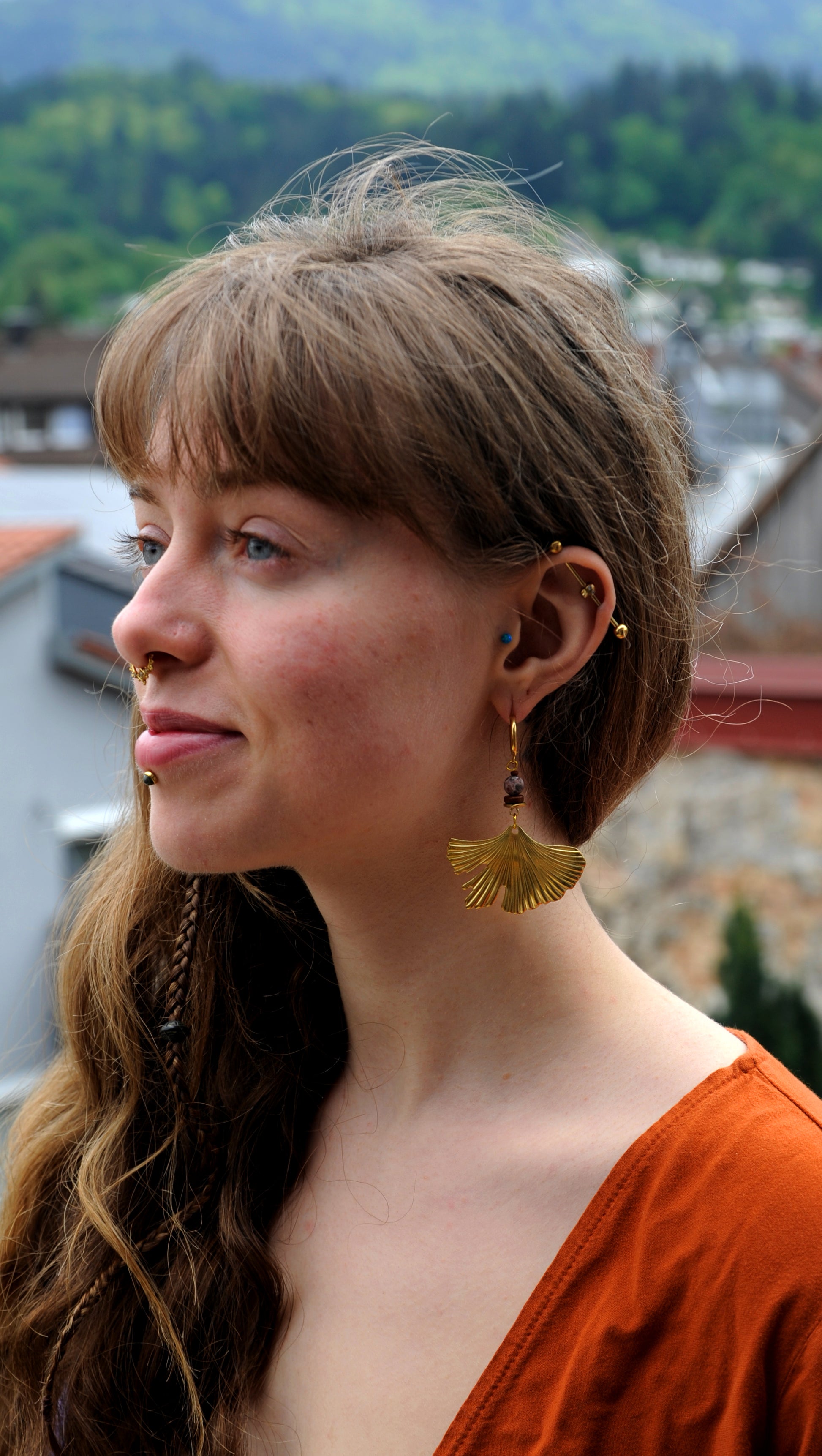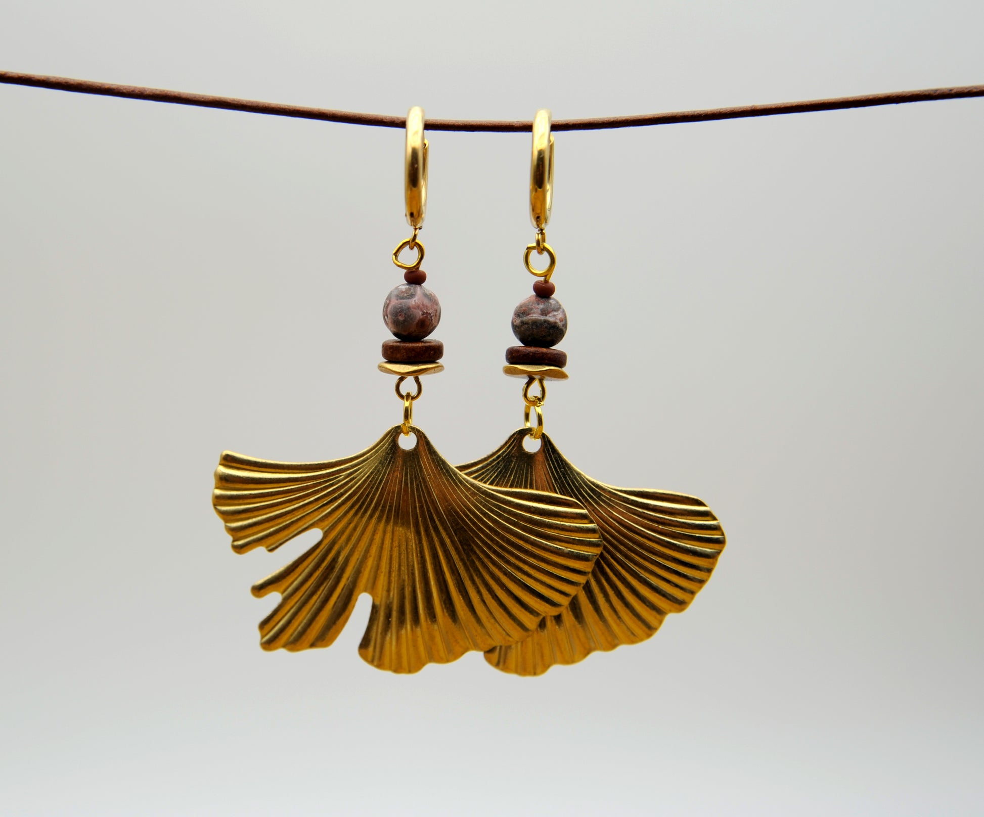 Die Golden Ginkgo Ohrringe vereinen große, fein strukturierte Ginkgo-Blätter aus vergoldetem Edelstahl mit erdigen, handverlesenen Details: einer Lava-Perle, einer goldenen Messing-Disc und einer braunen Keramikscheibe.