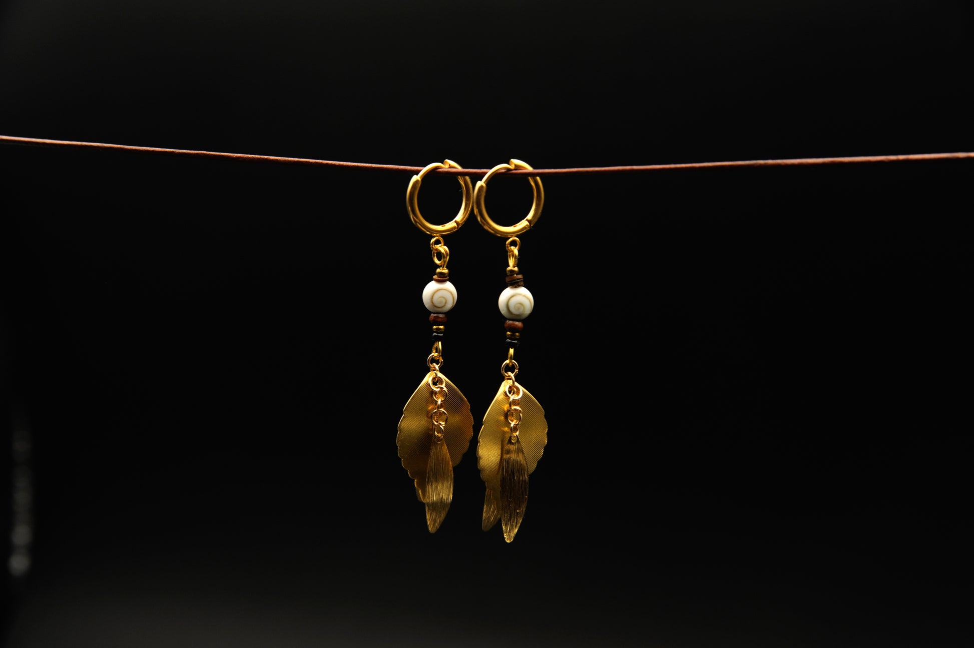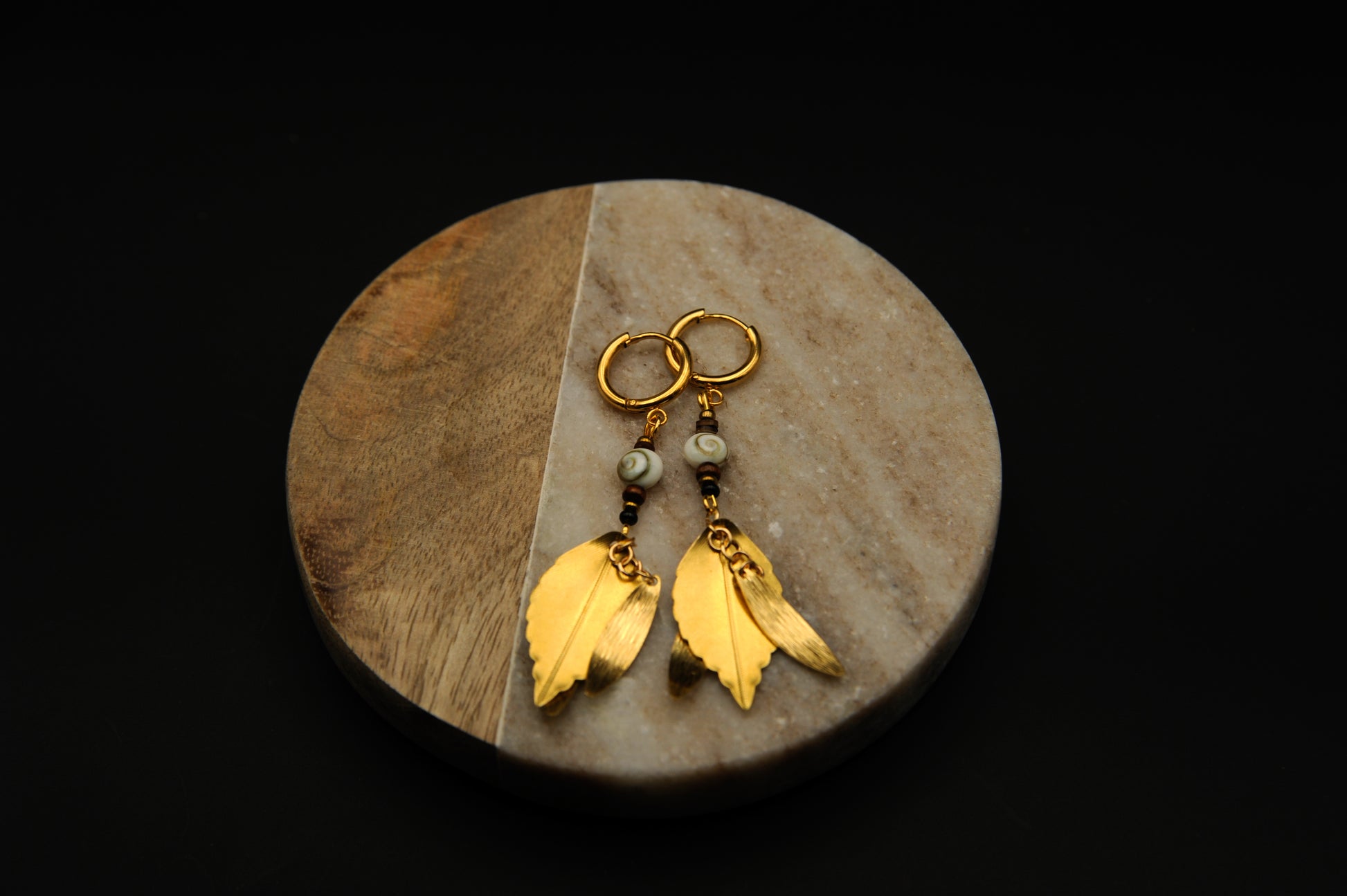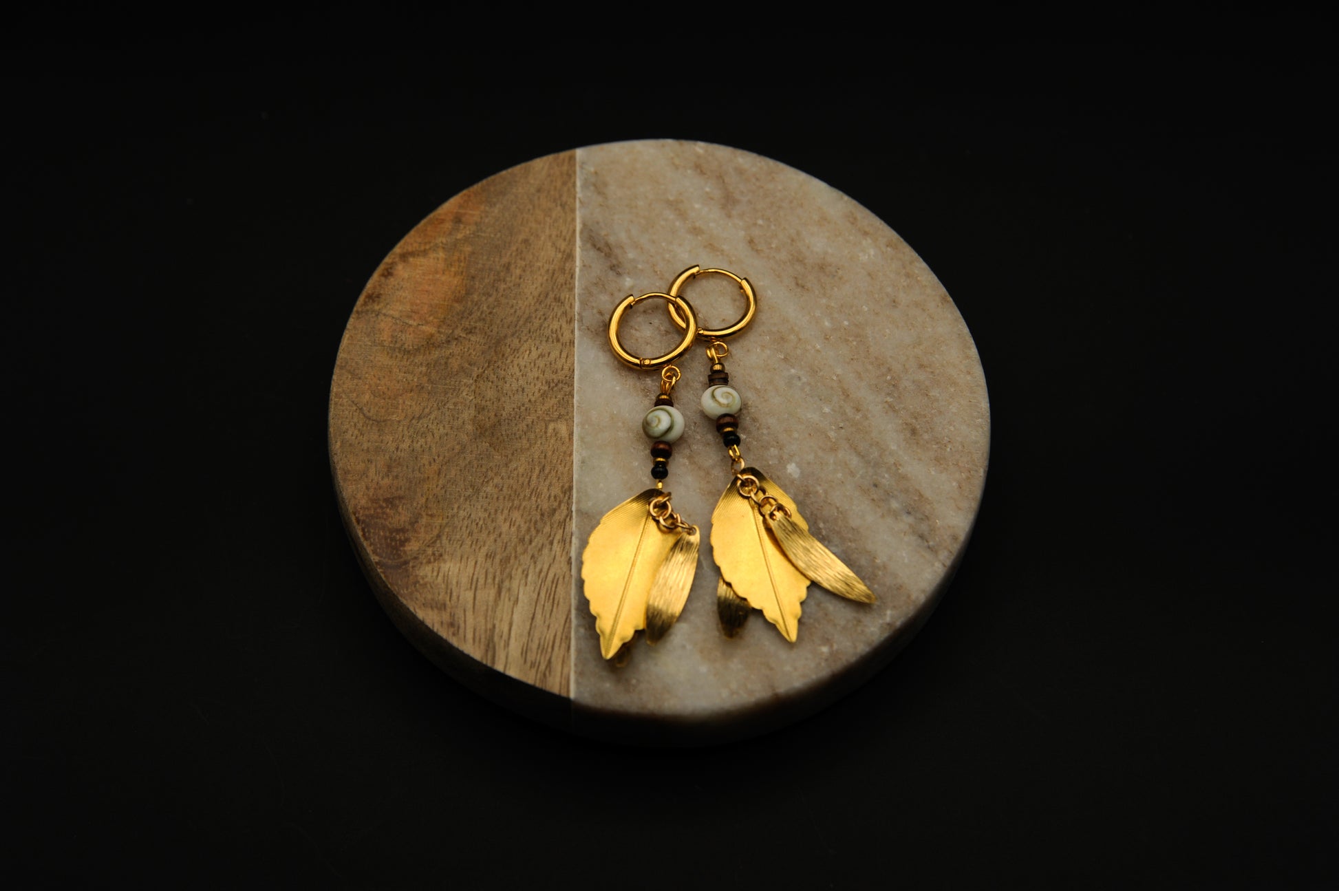 Golden Spiral – Ohrringe mit Schneckenperle & goldenen Blättern