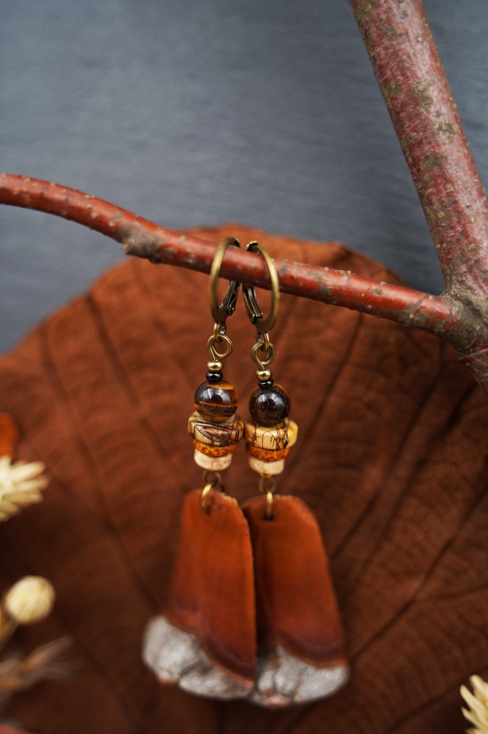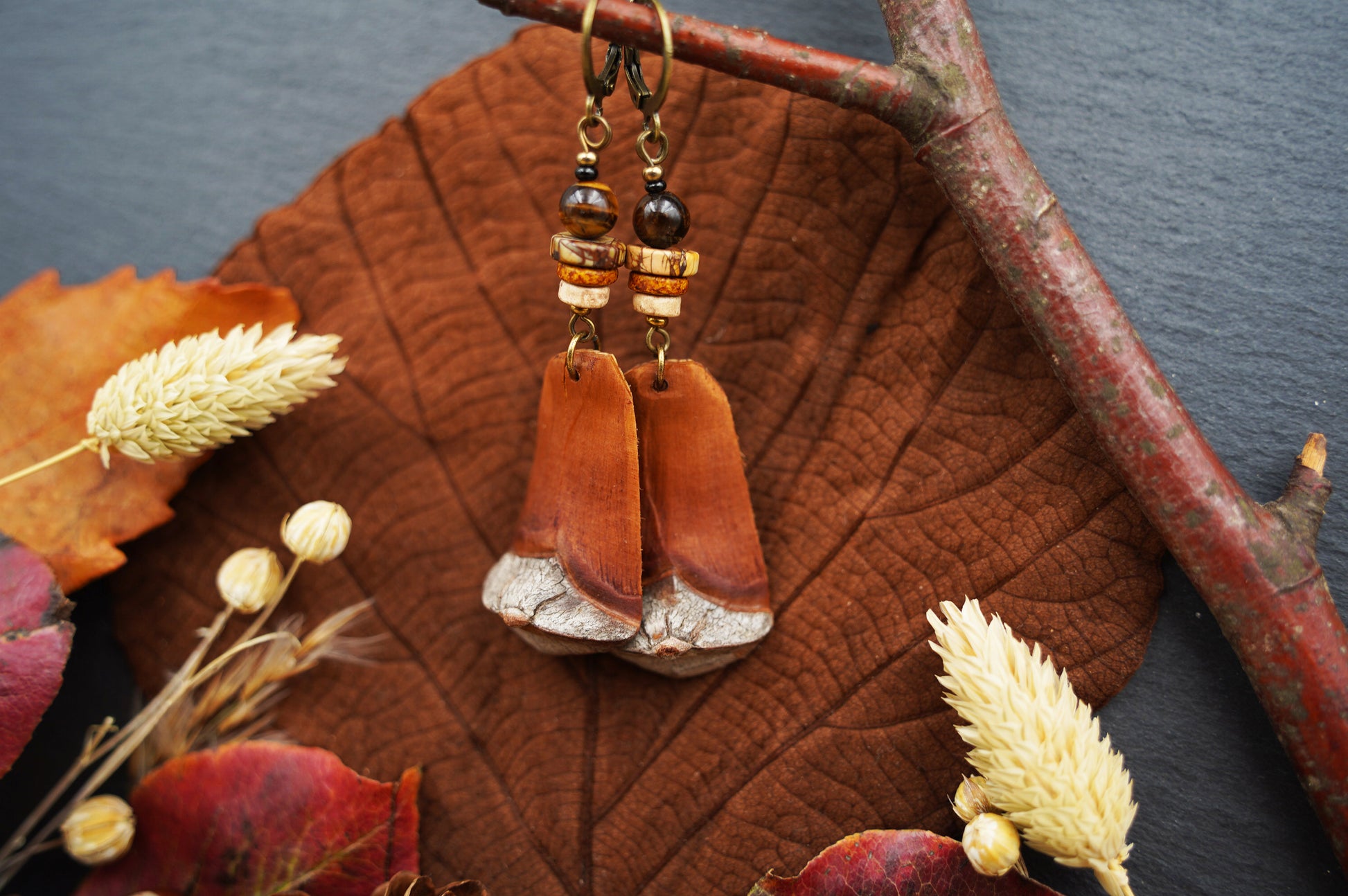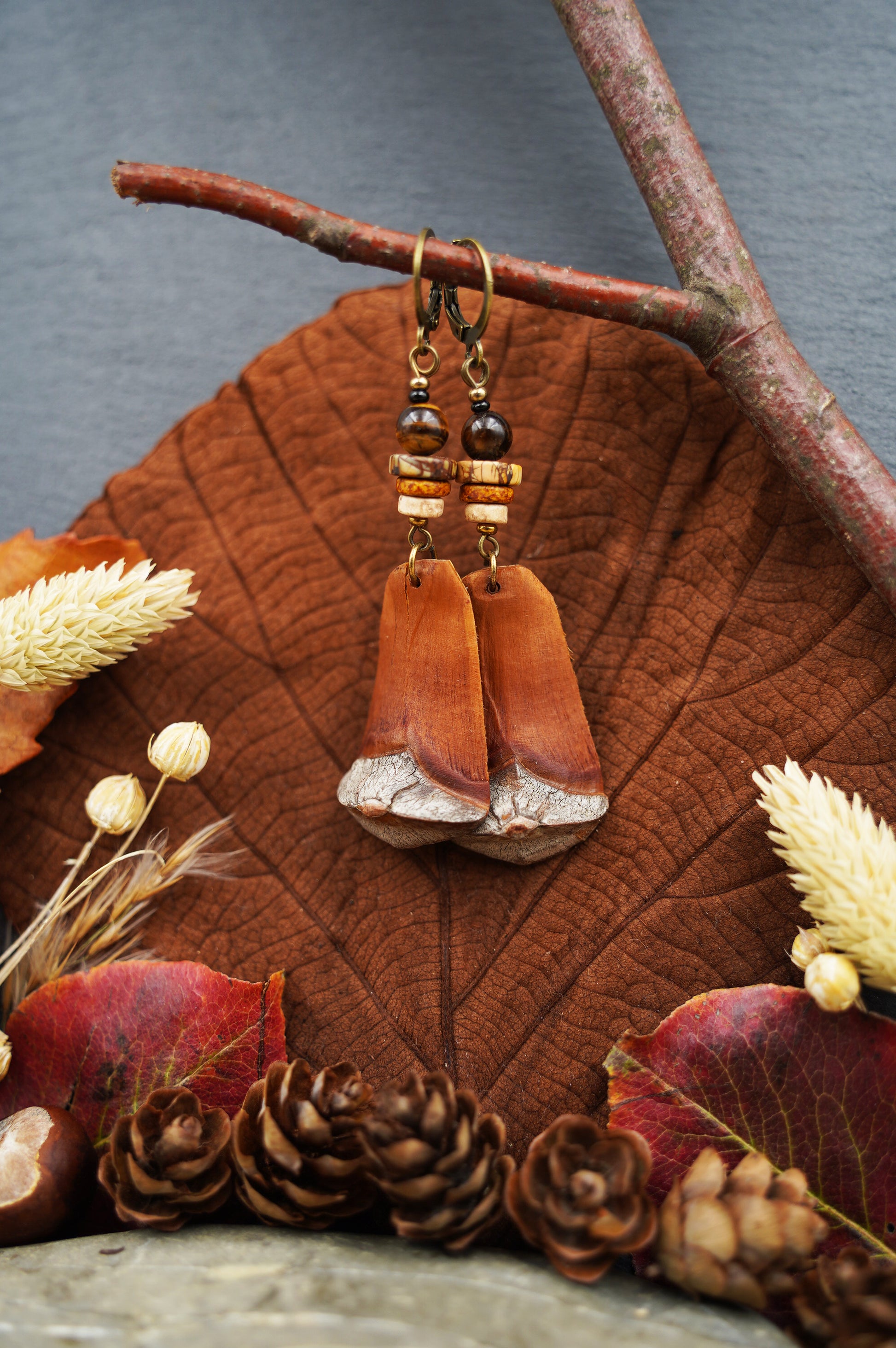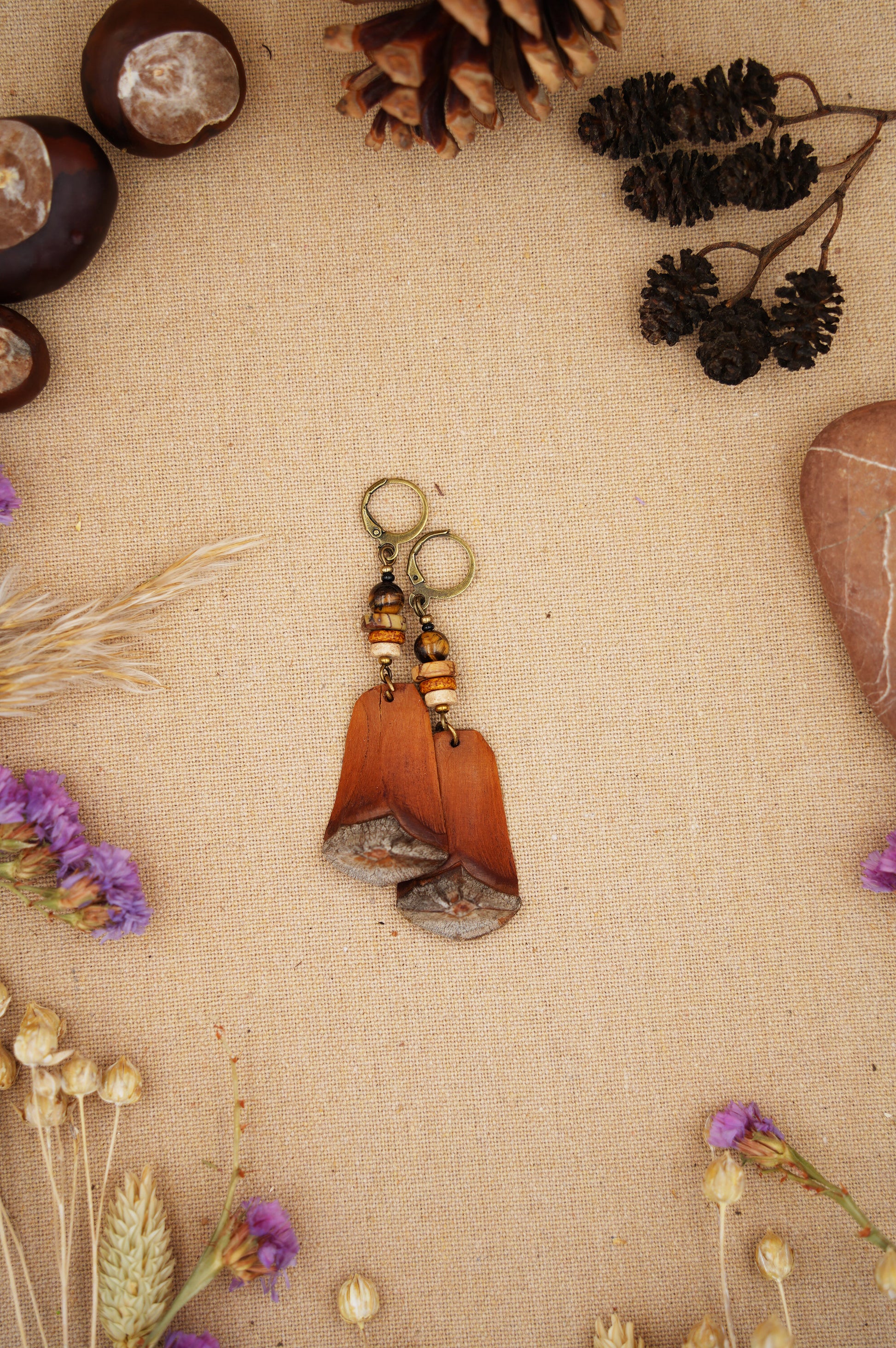 Diese handgefertigten Ohrringe bestehen aus echten Kiefernzapfenschuppen, ergänzt durch eine kraftvolle Tigerauge-Perle und zwei strukturierte Picasso-Jaspis-Discs.