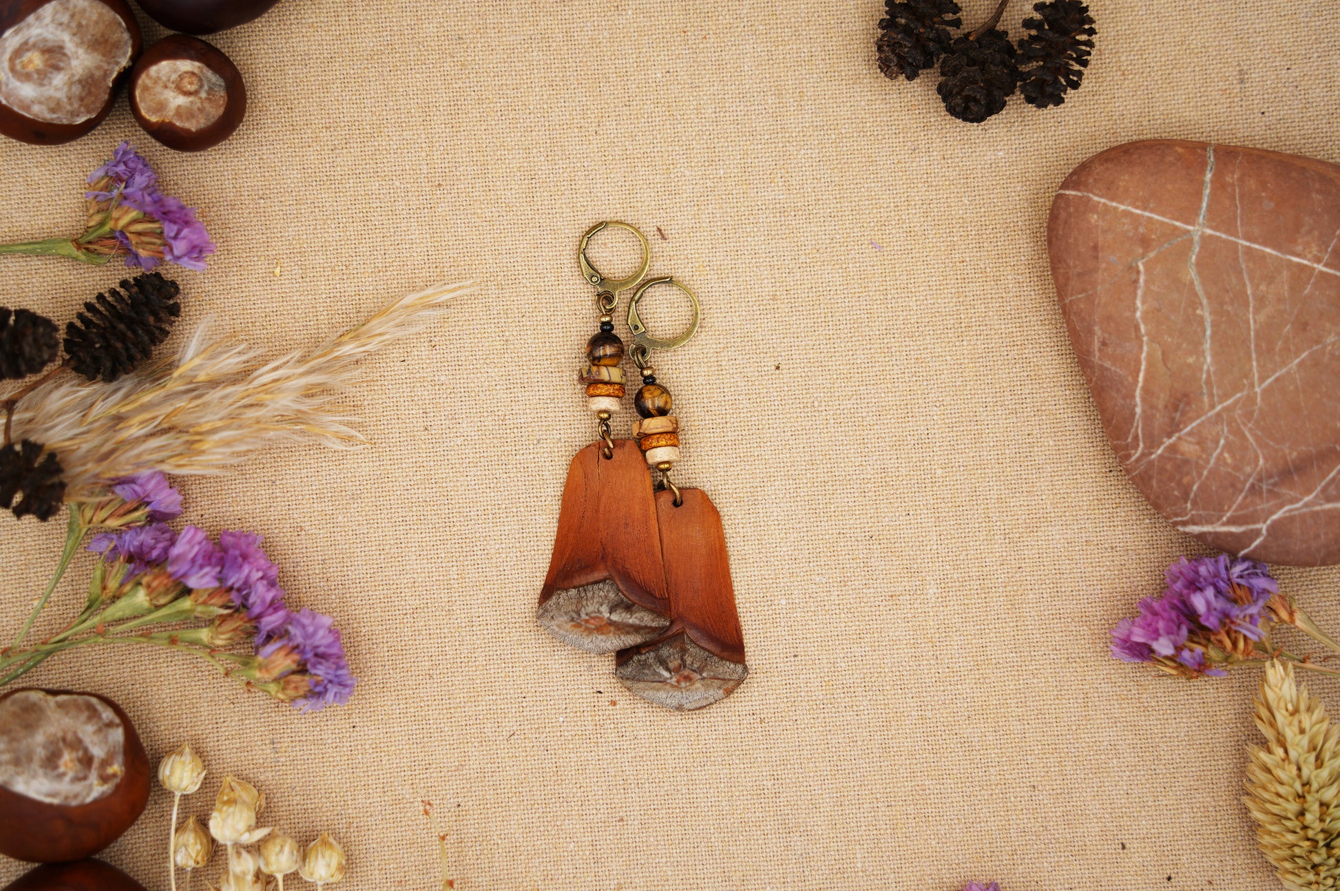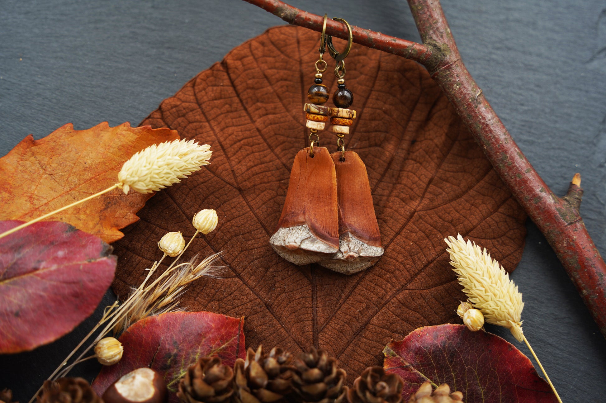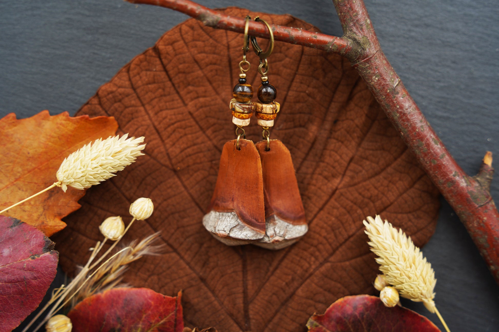 Diese handgefertigten Ohrringe bestehen aus echten Kiefernzapfenschuppen, ergänzt durch eine kraftvolle Tigerauge-Perle und zwei strukturierte Picasso-Jaspis-Discs.
