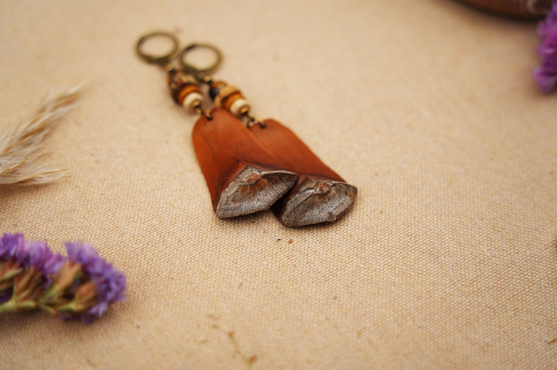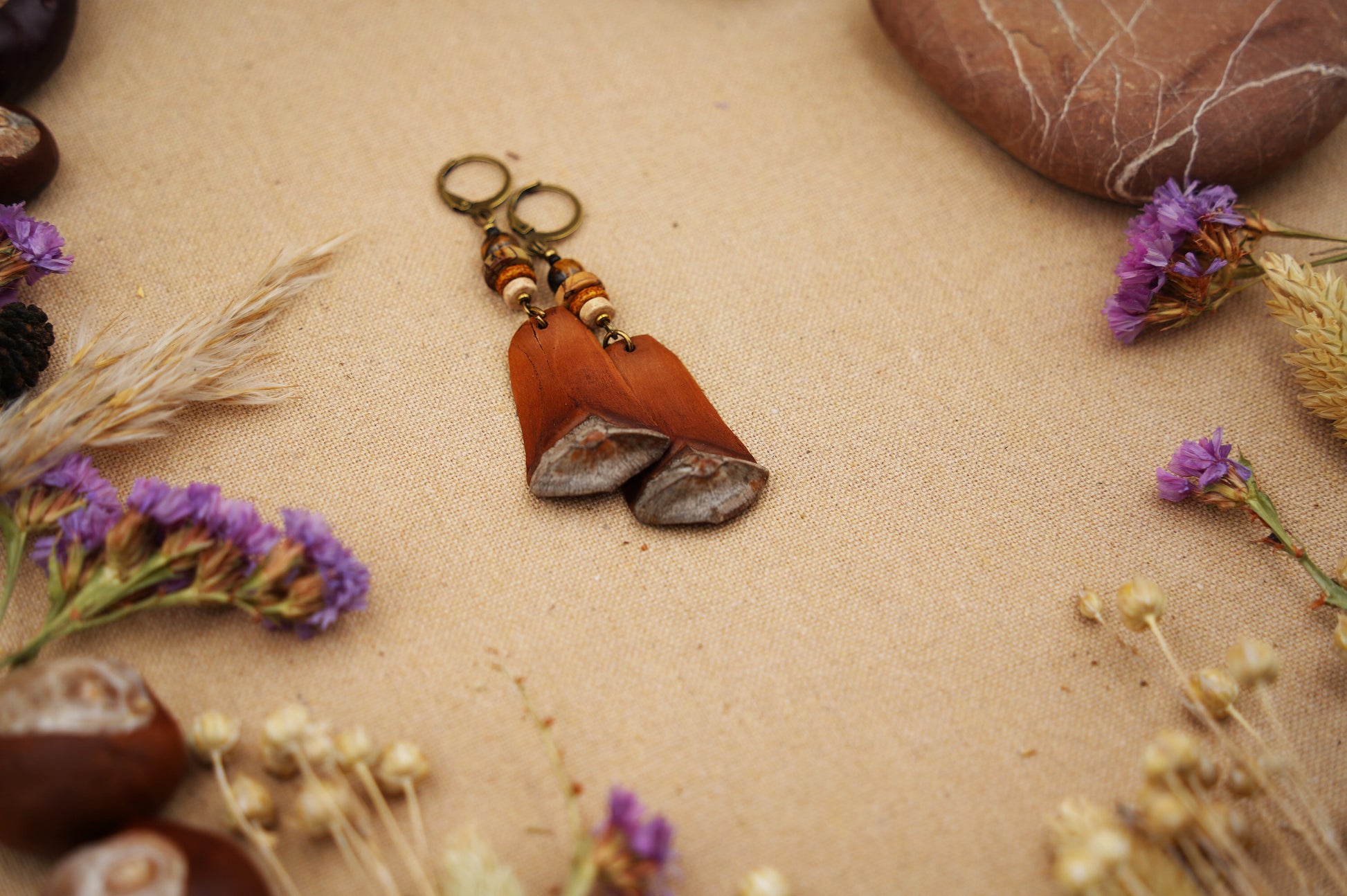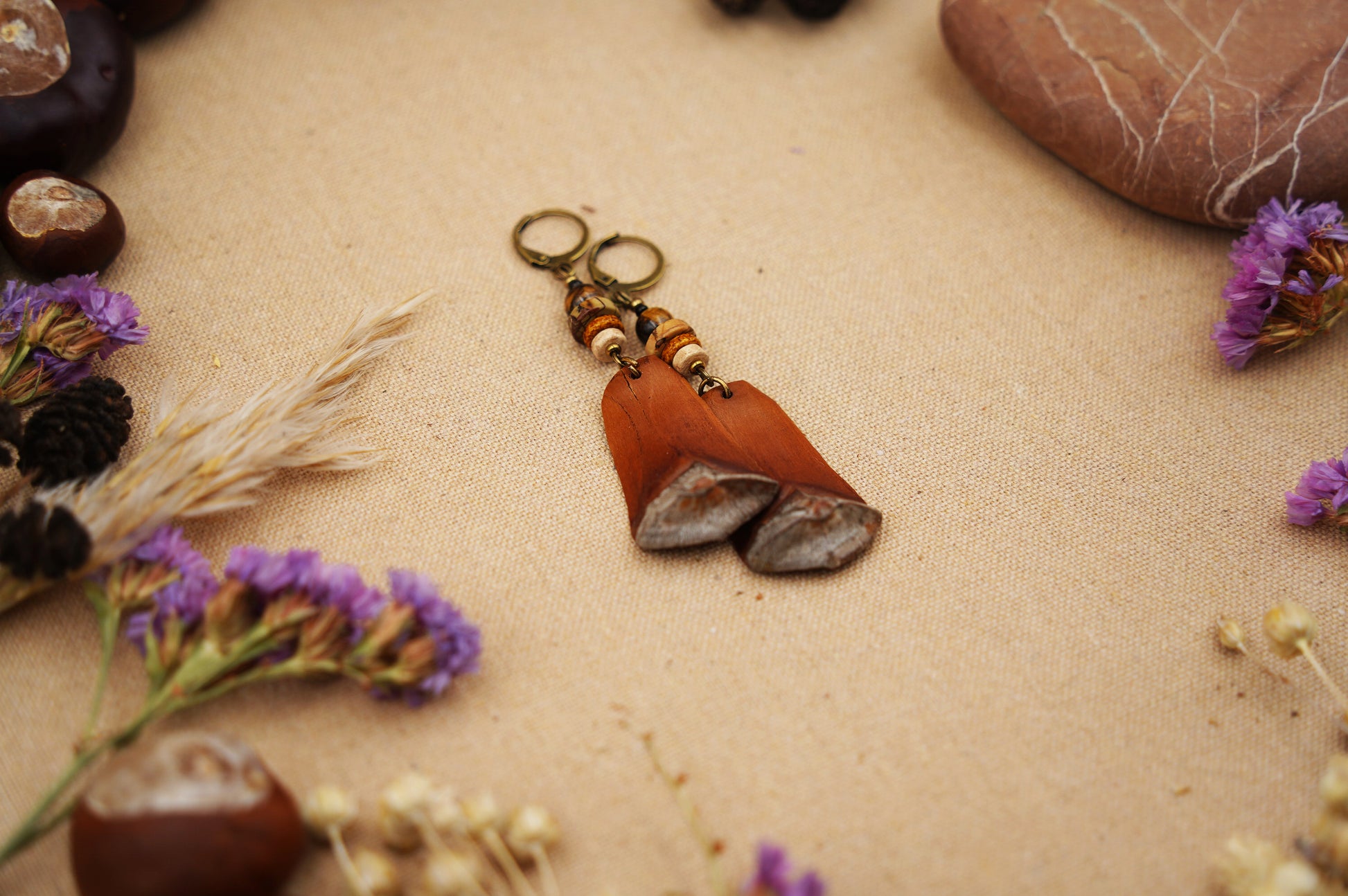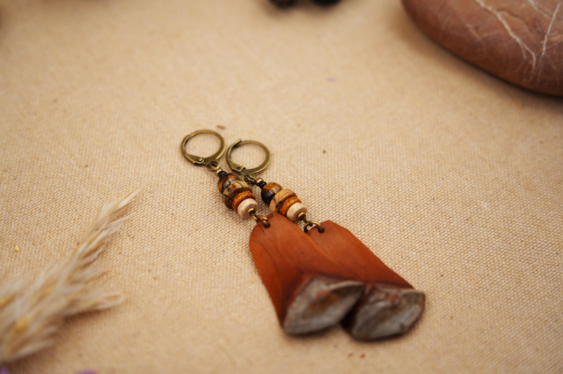 Diese handgefertigten Ohrringe bestehen aus echten Kiefernzapfenschuppen, ergänzt durch eine kraftvolle Tigerauge-Perle und zwei strukturierte Picasso-Jaspis-Discs.