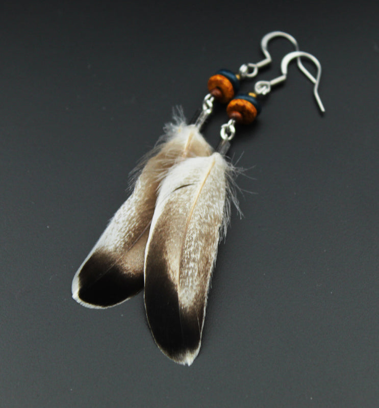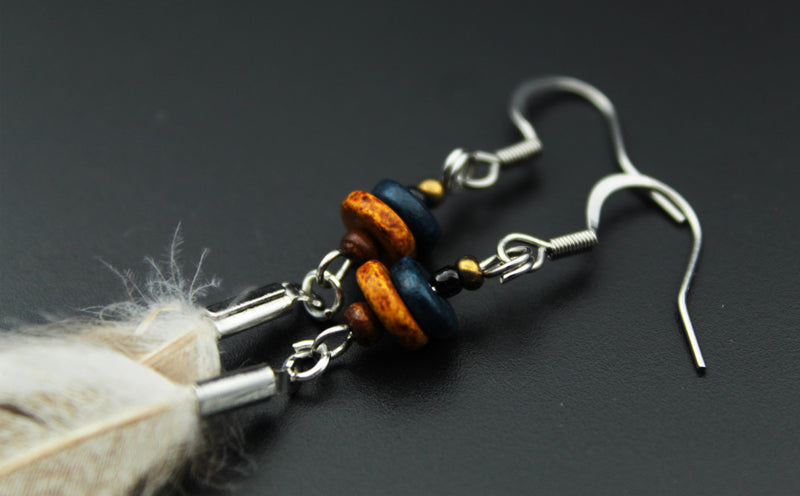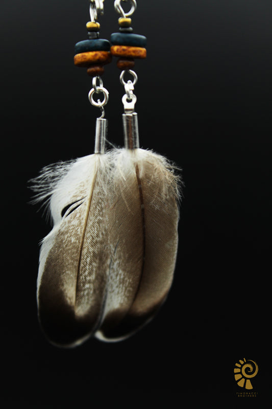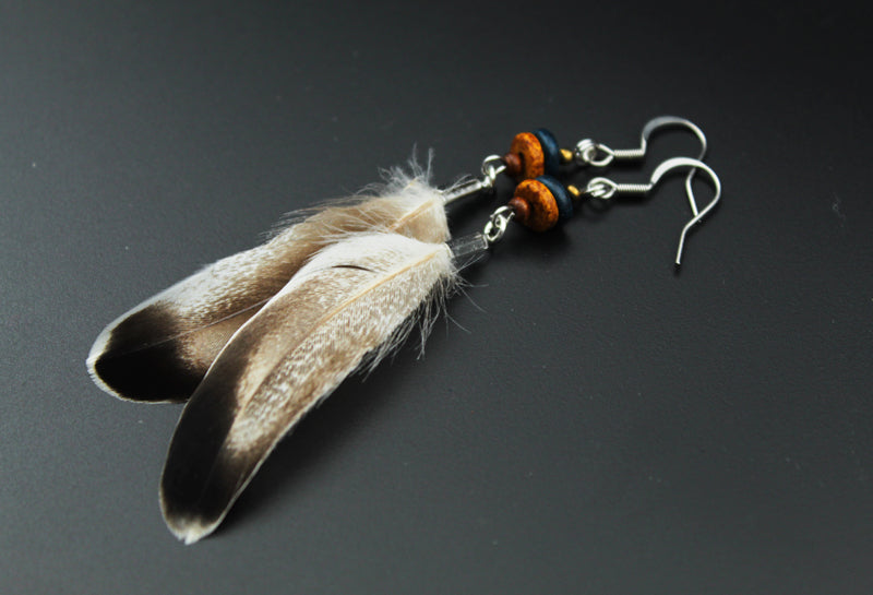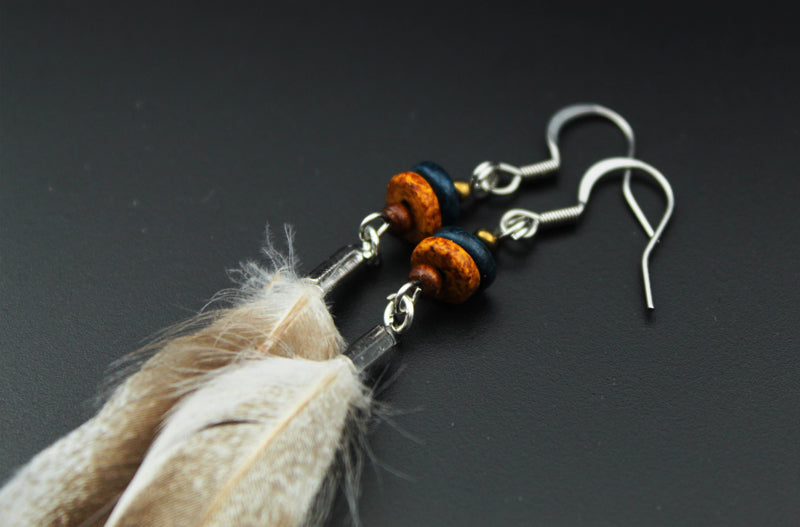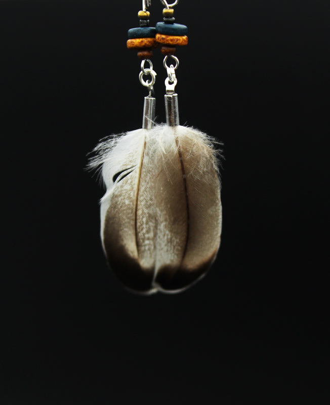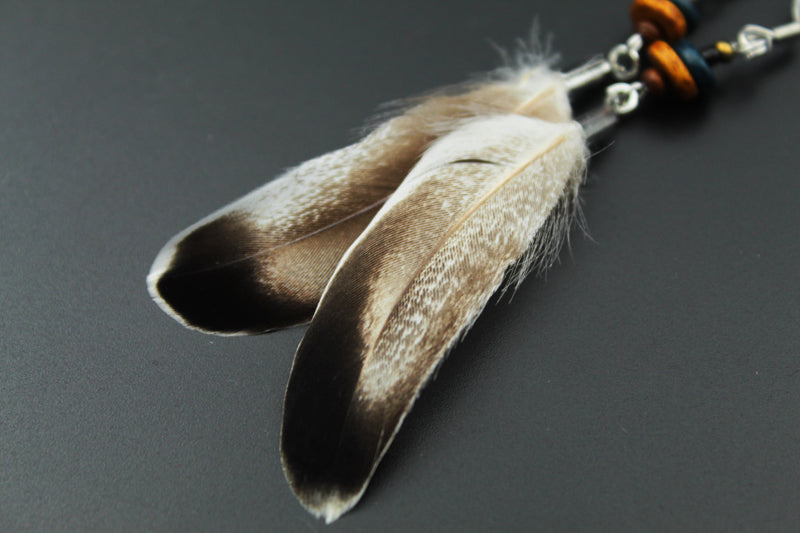 Die Hauptfedern stammen von der Ente und zeigen ein feines, naturbelassenes Muster in Beige- und Brauntönen mit dunkler Spitze. Über den Federn sitzen flache Keramik-Disk-Perlen in warmen Erdtönen, die dem Design einen rustikal-edlen Akzent verleihen.