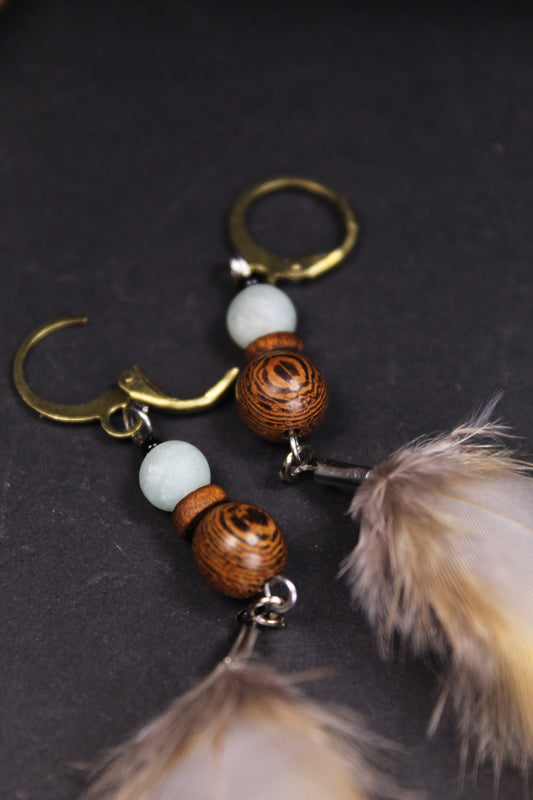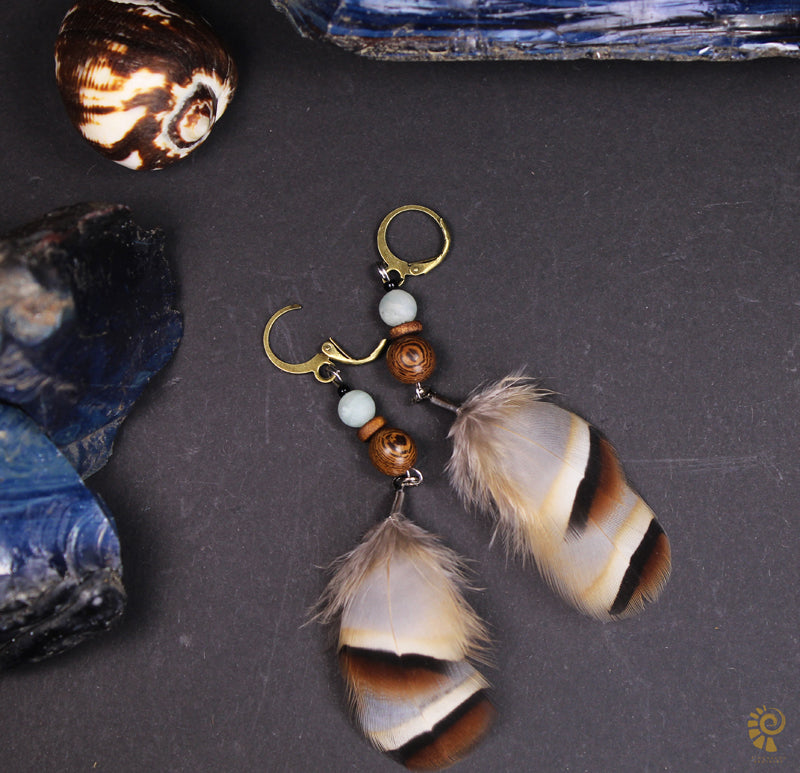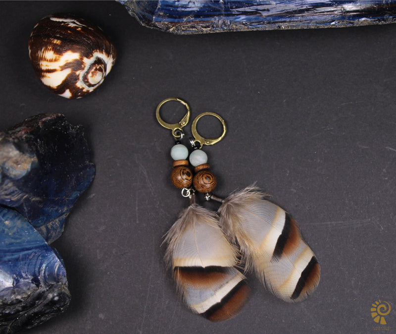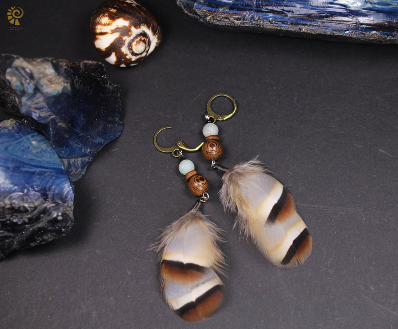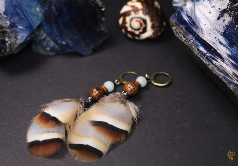 Die Federn stammen vom Steinhuhn und zeigen ein markantes Streifenmuster in warmen Braun-, Beige- und Schwarztönen. Über den Federn sind eine glatte Mineralperle in zartem Weiß mit Blaustich sowie eine fein gearbeitete Holzperle platziert, die dem Design Tiefe und Struktur verleihen.