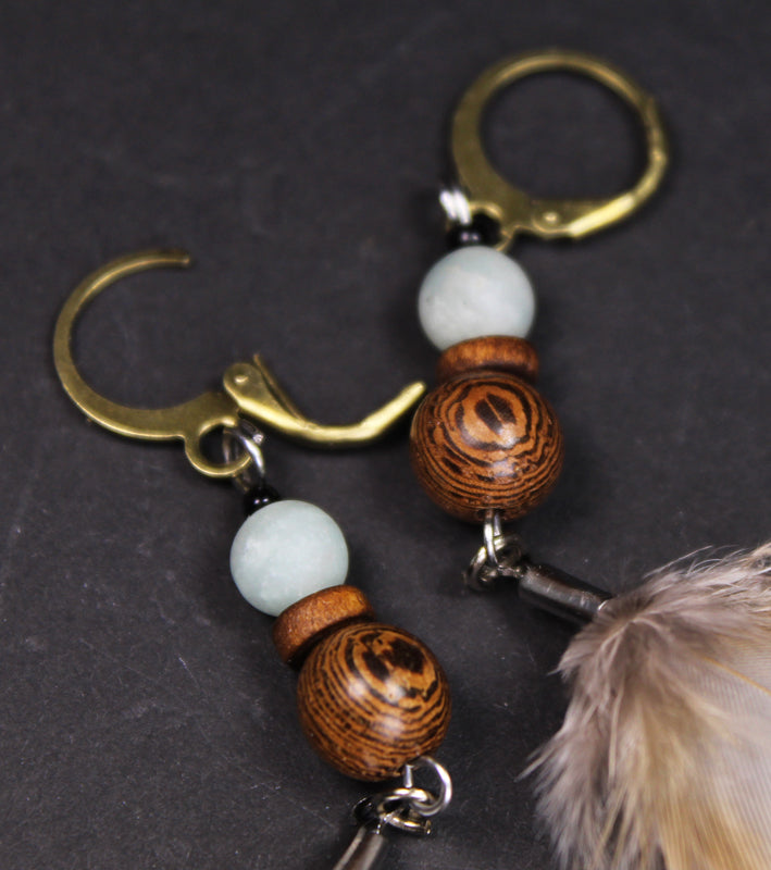 Kleine Federohrringe aus Steinhuhn Federn mit Holzperlen & Mineralperlen