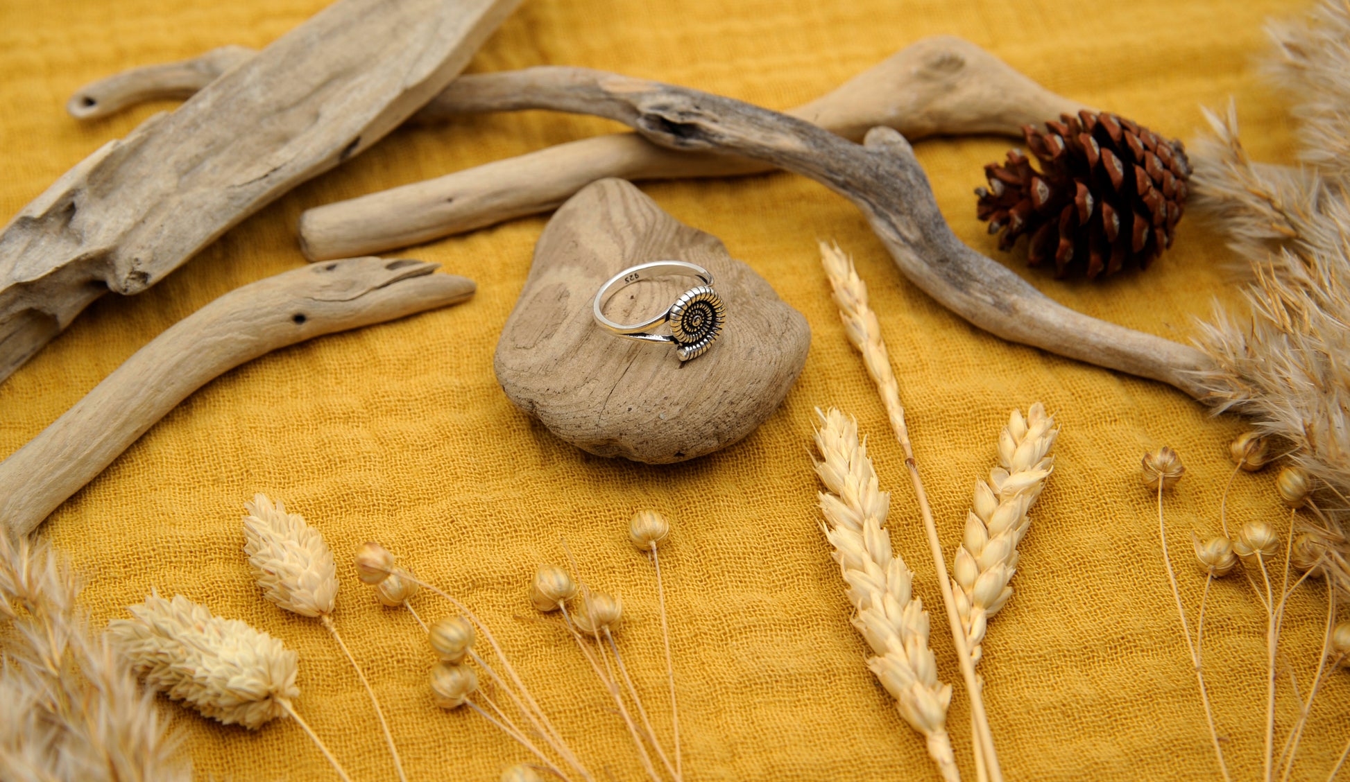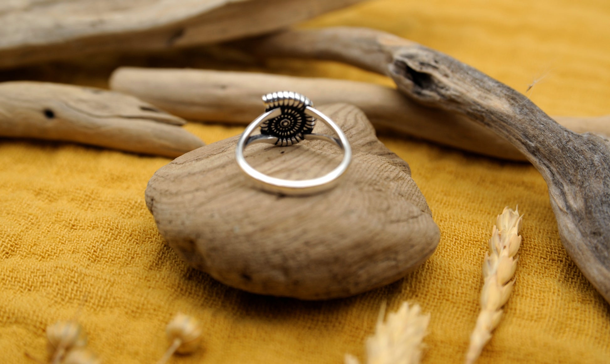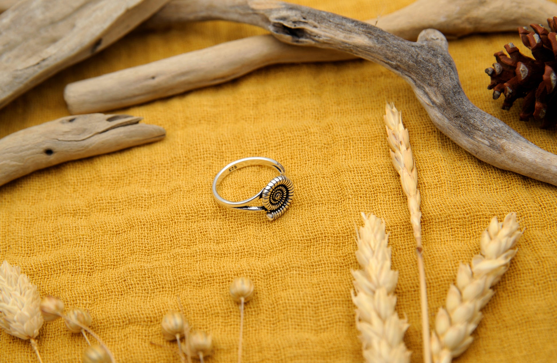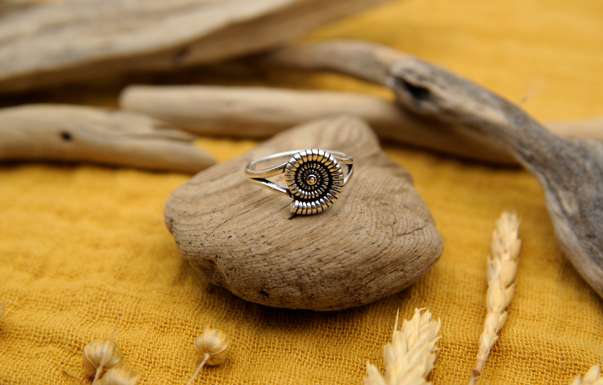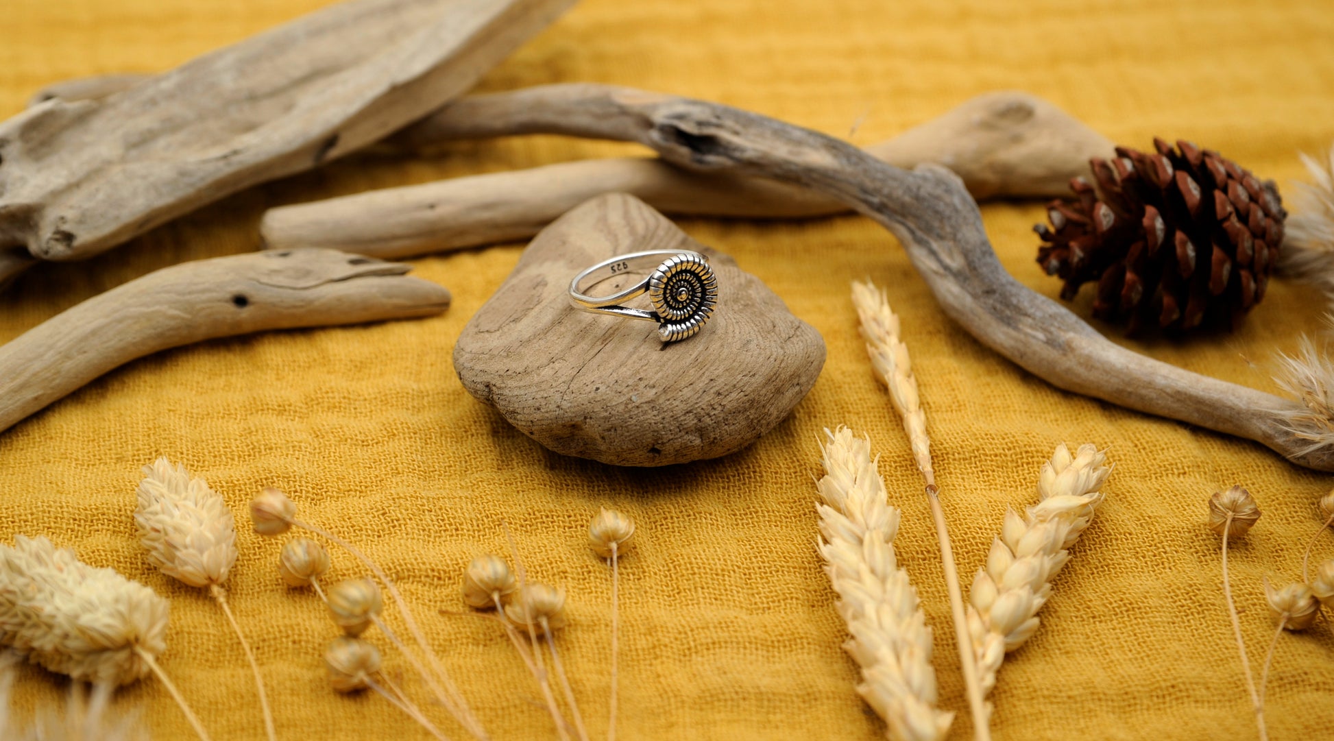 Dieser detailreiche Silberring ist inspiriert von der Form eines Ammoniten – einem fossilen Meeresbewohner, der seit Millionen von Jahren als Symbol für Wachstum, Evolution und Beständigkeit gilt. Das kunstvoll gearbeitete Spiral-Design bringt Struktur und Charakter in jedes Outfit und macht den Ring zu einem zeitlosen Statement-Piece.